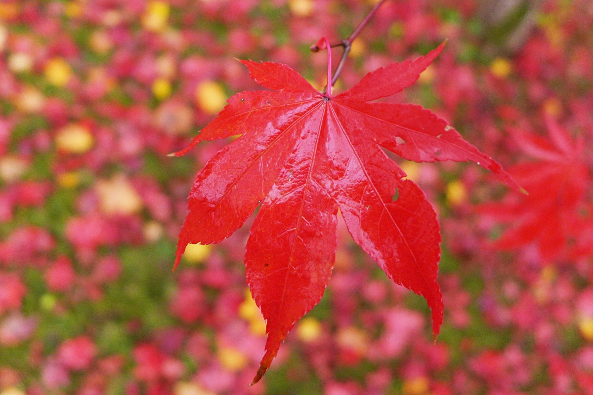 Das Herbstlaub "knallt" seine Farben auf den Chip ... vermutlich Acer palmatum 'Osakazuki' (Sortenangabe unsicher, einer der Jap. Fächerahorn-Kultivare, der ansonsten grünes Laub hat und erst jetzt so eine unglaubliches Rot zeigt.)