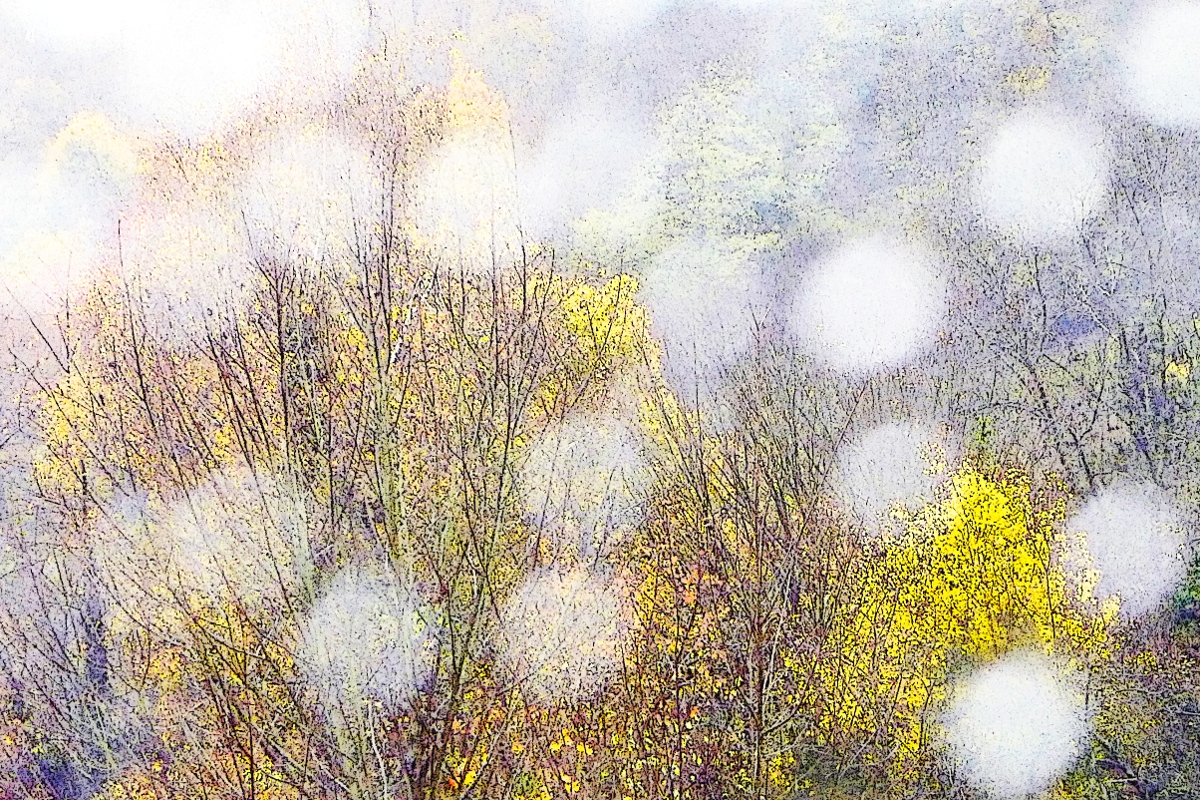 Und was hier schon aussieht wie Schnee ist NOCH keiner, sondern am gleichen Tag fotografierte ich durchs Fenster Regentropfen vor herbstlichen Bäumen, hier hatte ich manuell auf den Hintergrund scharf gestellt ... und ziemlich "extrem" bearbeitet ;)