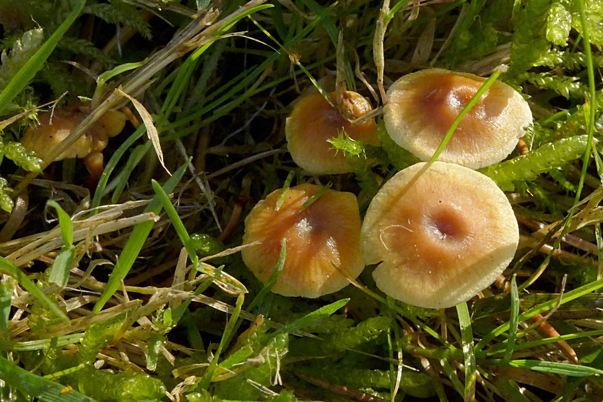 Am gleichen Ort, immer wieder auf der Wiese, kleine Jungfern-Ellerlinge, immer leicht bräunlich, laufen die alle unter Cuphophyllus virgineus ... oder sollte man unterscheiden, wg. der Farbe ... Cuphophyllus ochraceopallidus ?)