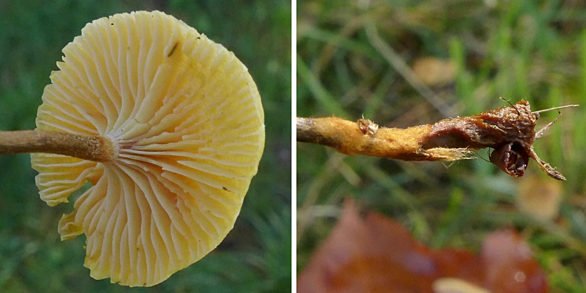 Am gleichen Ort, bei einer großen Kiefer, Wiederfund vom letzten Jahr, Glöckennabelinge, aber in der Streu (tief wurzelnd, auf kleinsten Teilchen wachsend). Den Geschmack habe ich jetzt probiert, die Pilze sind deutlich bitter. Dann müssten es Xeromphalina fellea/ cauticinalis sein, Gelber Glöckchennabeling