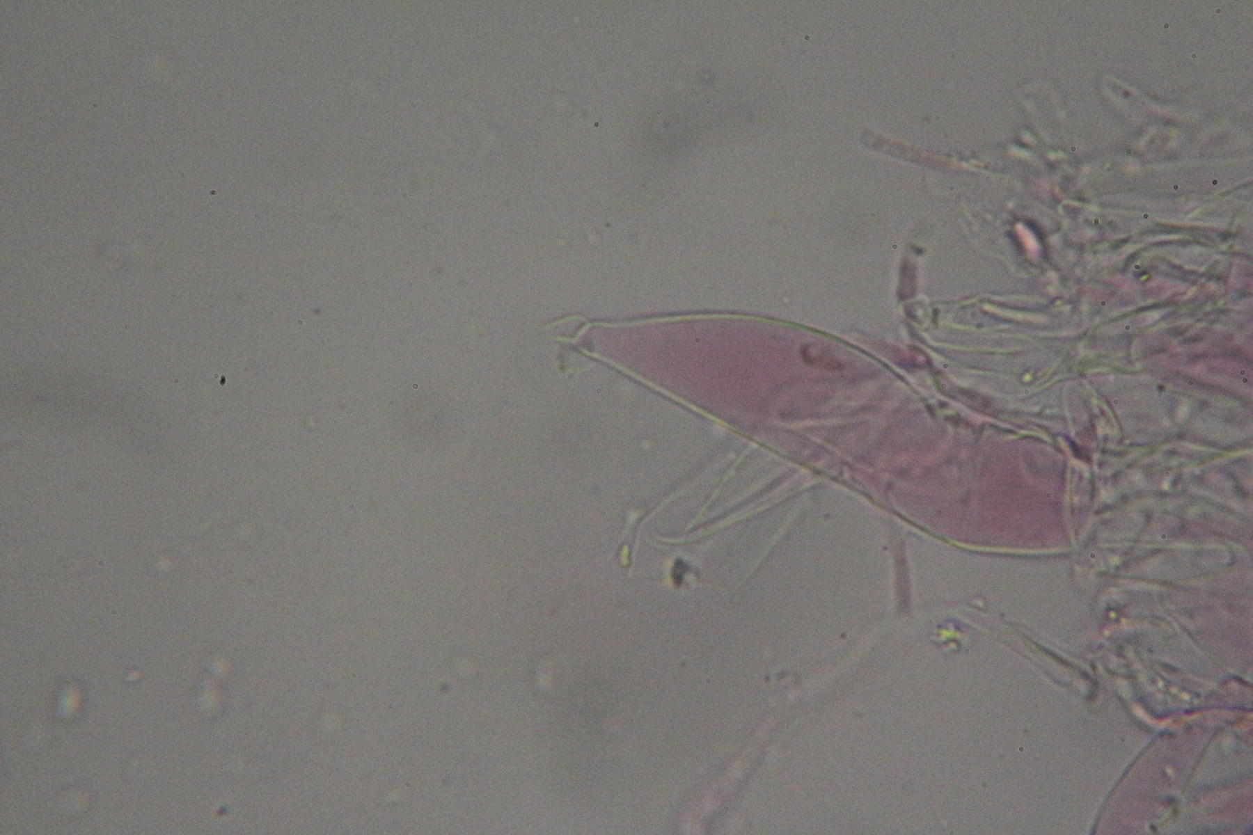 Stiel: 2 cm, Durchmesser 2-3mm kompakt, dunkelbraun, zur Basis hin dunkler, Zystiden unter der Lupe erahnbar.