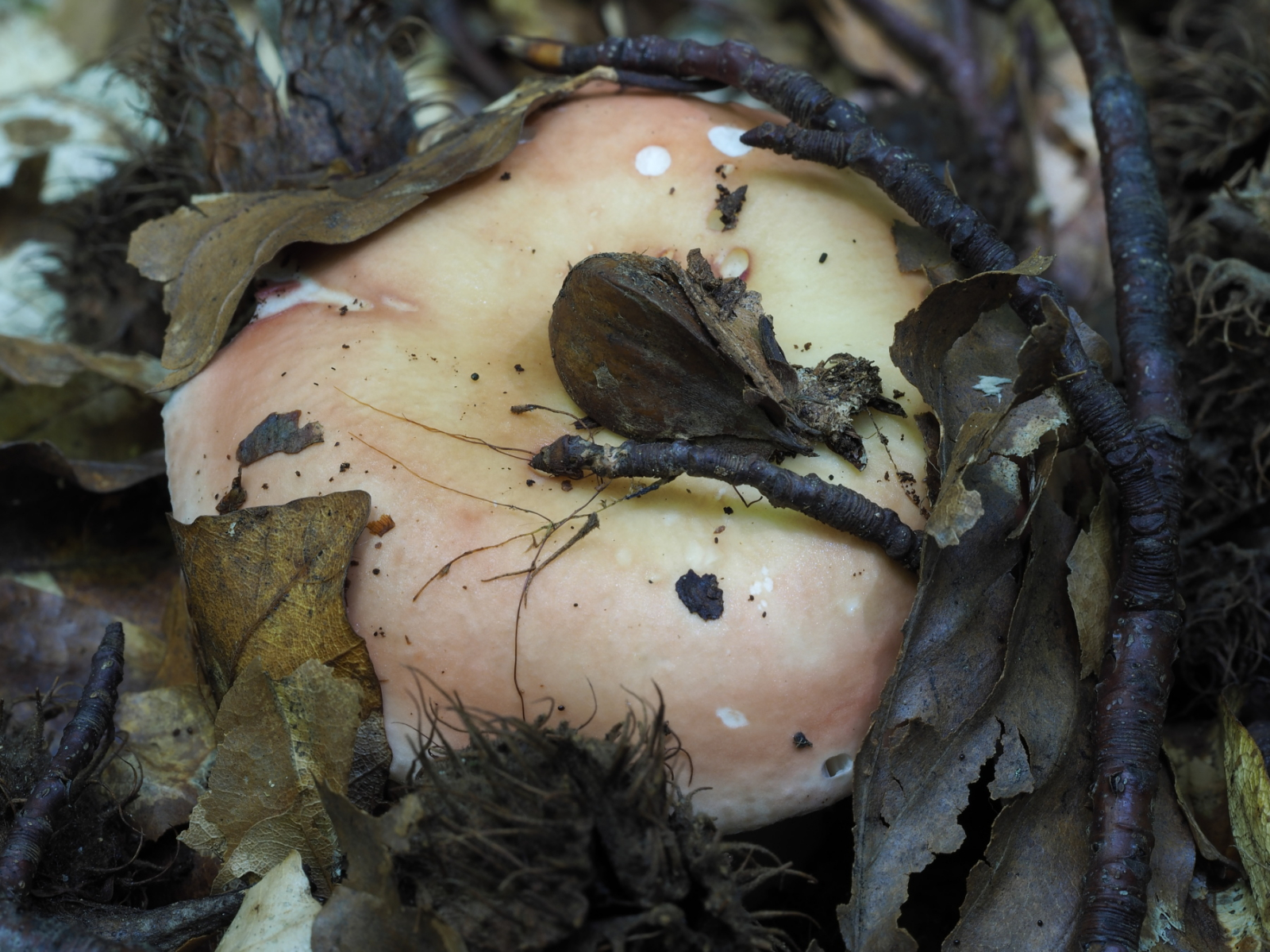 1) im Buchenwald, Hut 5,5cm, trocken, matt, vielfarbig, weiss, creme, gelb, rosa