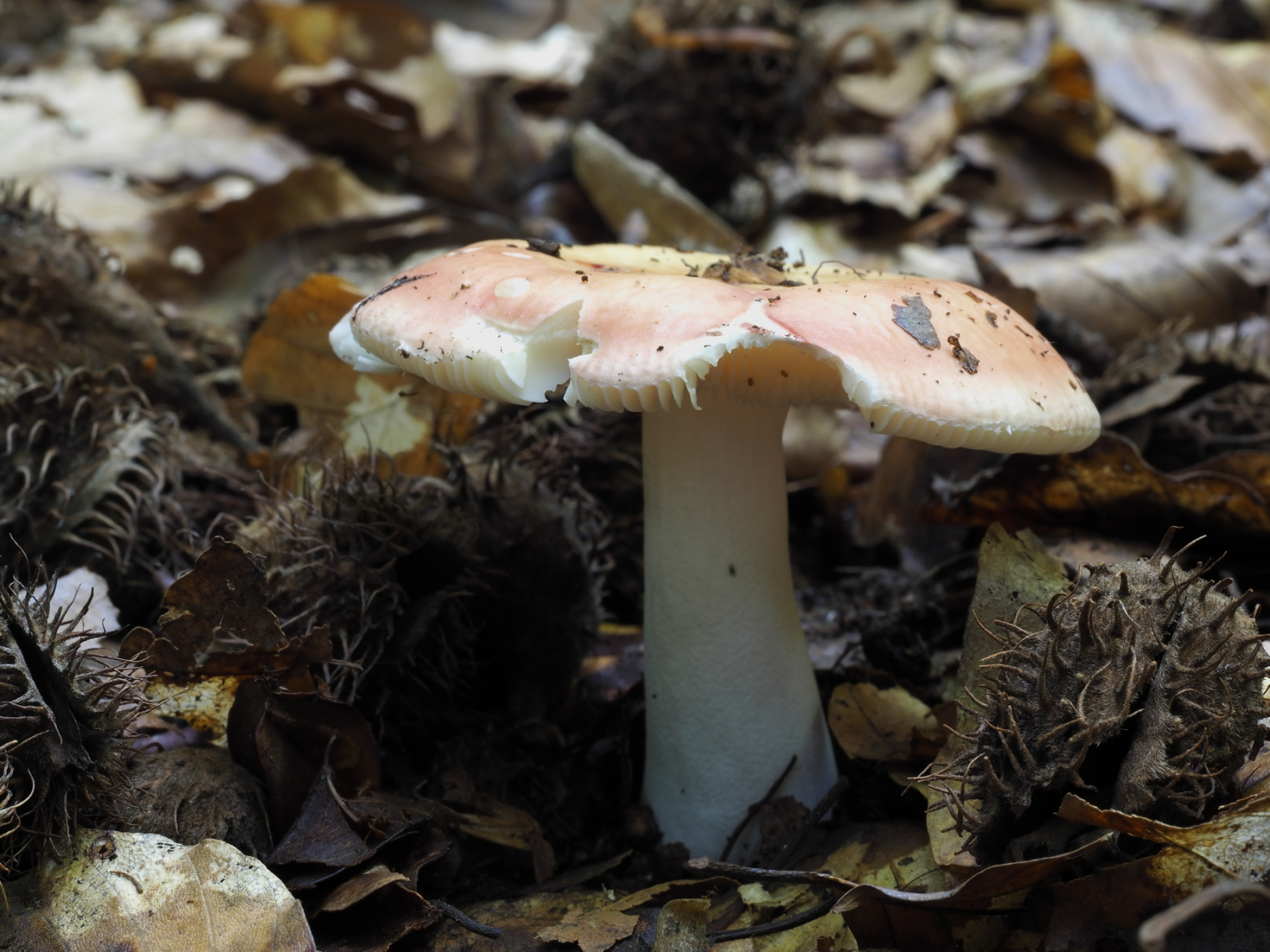 1) im Buchenwald, Hut 5,5cm, trocken, matt, vielfarbig, weiss, creme, gelb, rosa