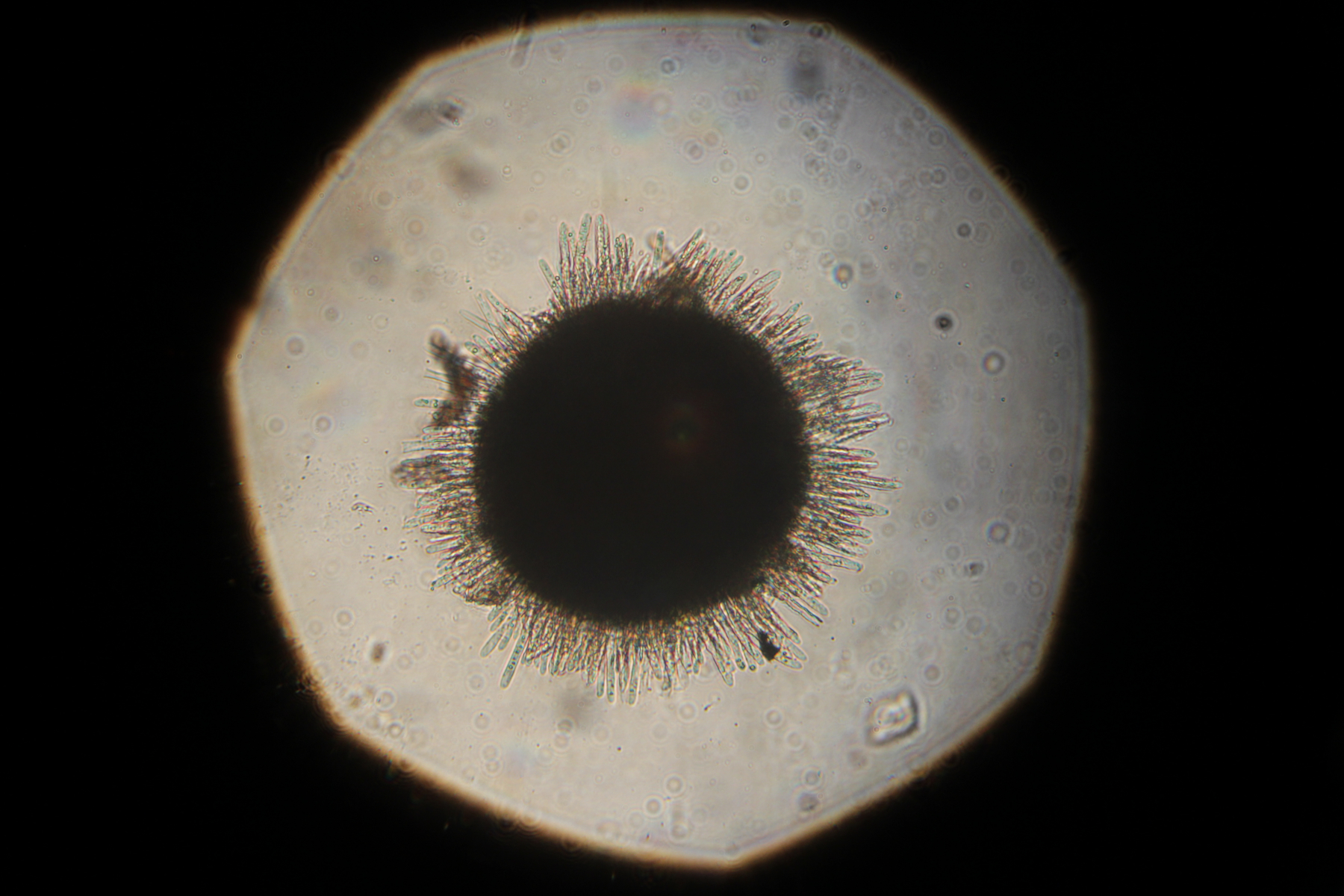 16. Kleiner schwarzer Pilz mit Härchen auf einem schilfartigem Gras