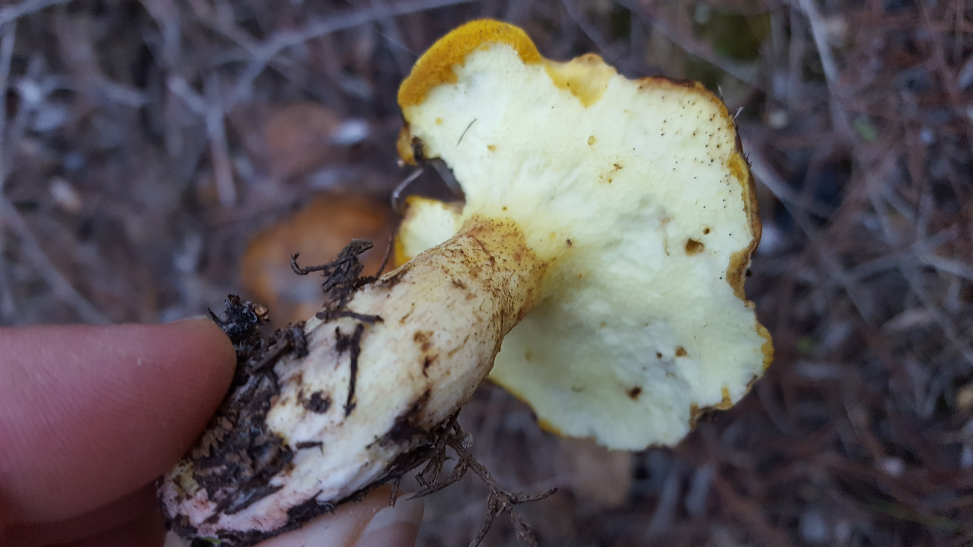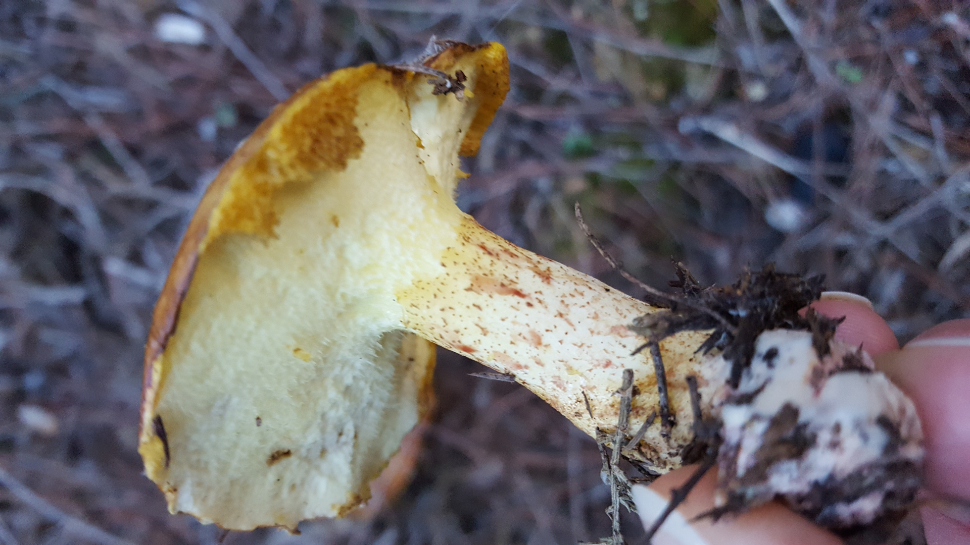 Es gibt noch eine alternative Suillus mediterraneensis aber den hat rosa Stielbasis . Hat dein Fund rosaStielbasis . Myzel , auf dein Bild ist nicht gut zu sehen ?LG beli !