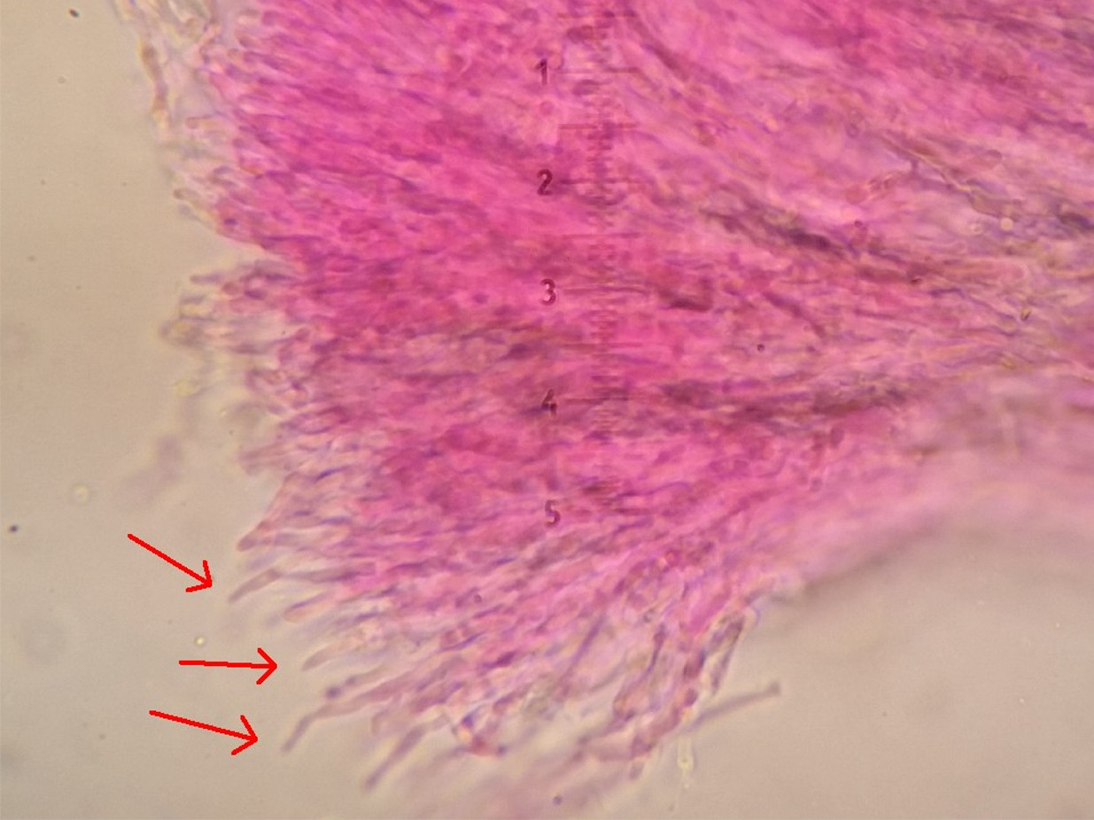 Die Suche nach Zystiden ähnliche Elemente erwies sich als sehr schwierig, falls es überhaupt welche sind dann fand ich nur das hier
