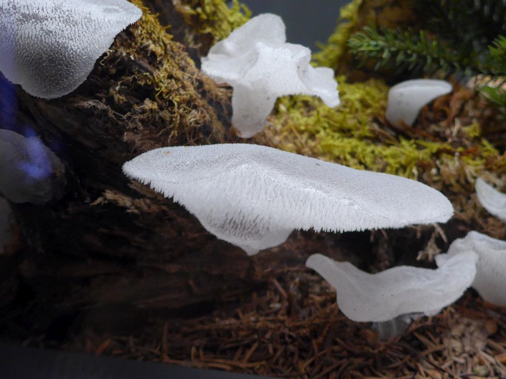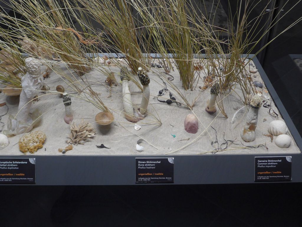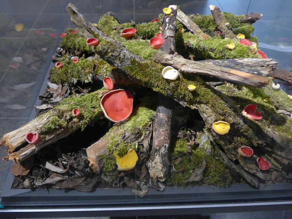 Ein weiterer Raum hatte die Ökologie zum Grundthema. Das Hauptaugenmerk waren einige große Plakate (insgesamt als Säule angeordnet) wo die wichtigsten Naturräume vorgestellt wurden. Vor jedem dieser Plakate waren 2 große Vitrinen aufgestellt, wo die jeweiligen typischen Pilzarten dieser Habitate als täuschned echt aussehende Modelle präsentiert wurden. Drumherum wurde die Rolle der Pilze nicht nur als Mykorrhiza beschrieben, nein es wurde auch eindrucksvoll gezeigt, was mit den Wäldern passieren würde, wenn eben keine Destruenten das Totholz zersetzen würden, es keine insekten- und phytopathogene Pilze gäbe usw. Auch hier wurden Überlebensgroße Psilocyben ausgestellt, die auch noch witzigerweise mit verschiedenen Lichtfarben illuminiert wurden. :D Ein Geniestreich. :thumbup: Zudem wurde dort auch das Thema Flechten und Insektenpathogene Pilze ausgiebigst beleuchtet.