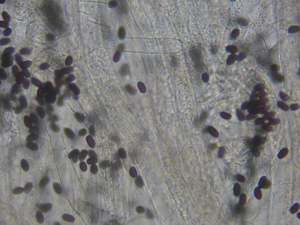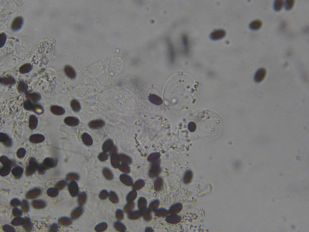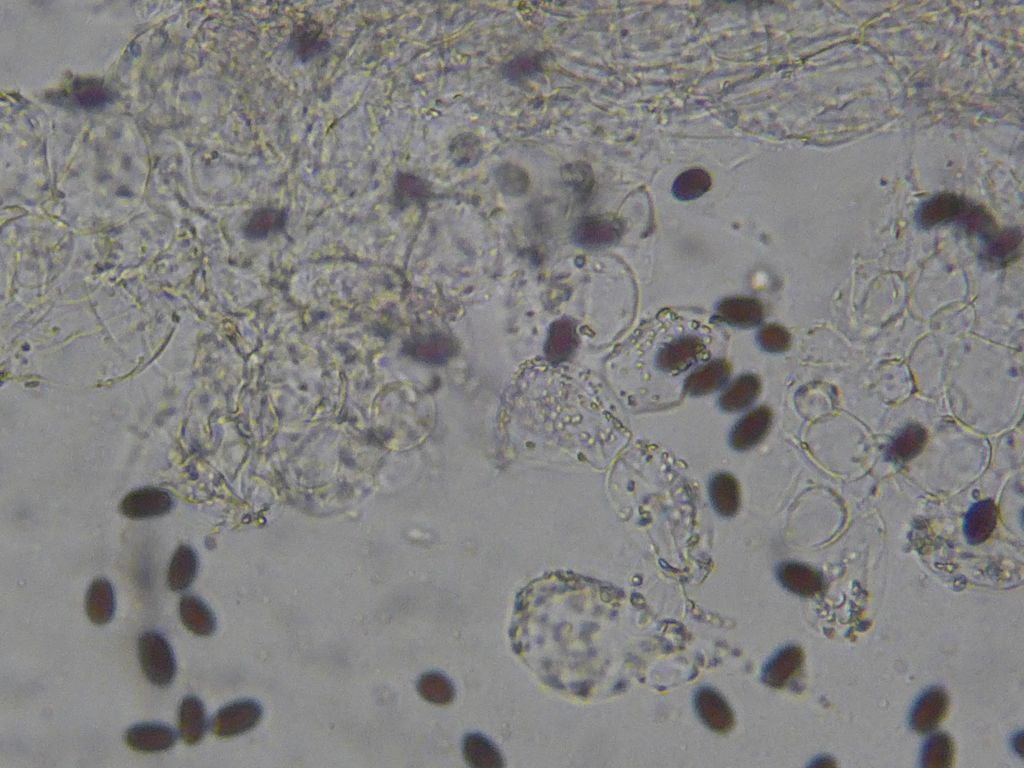 Sporen: schlank, ich würde die schon fast subcylindrisch nennen 9,5-15 x 5,5-7 µm, wobei die meisten Sporen die ich gemessen habe 12-13 µm lang waren. Nur eine einzelne Spore war 15 µm lang. Keimporus war zentral, aber sehr schwer zu sehen.