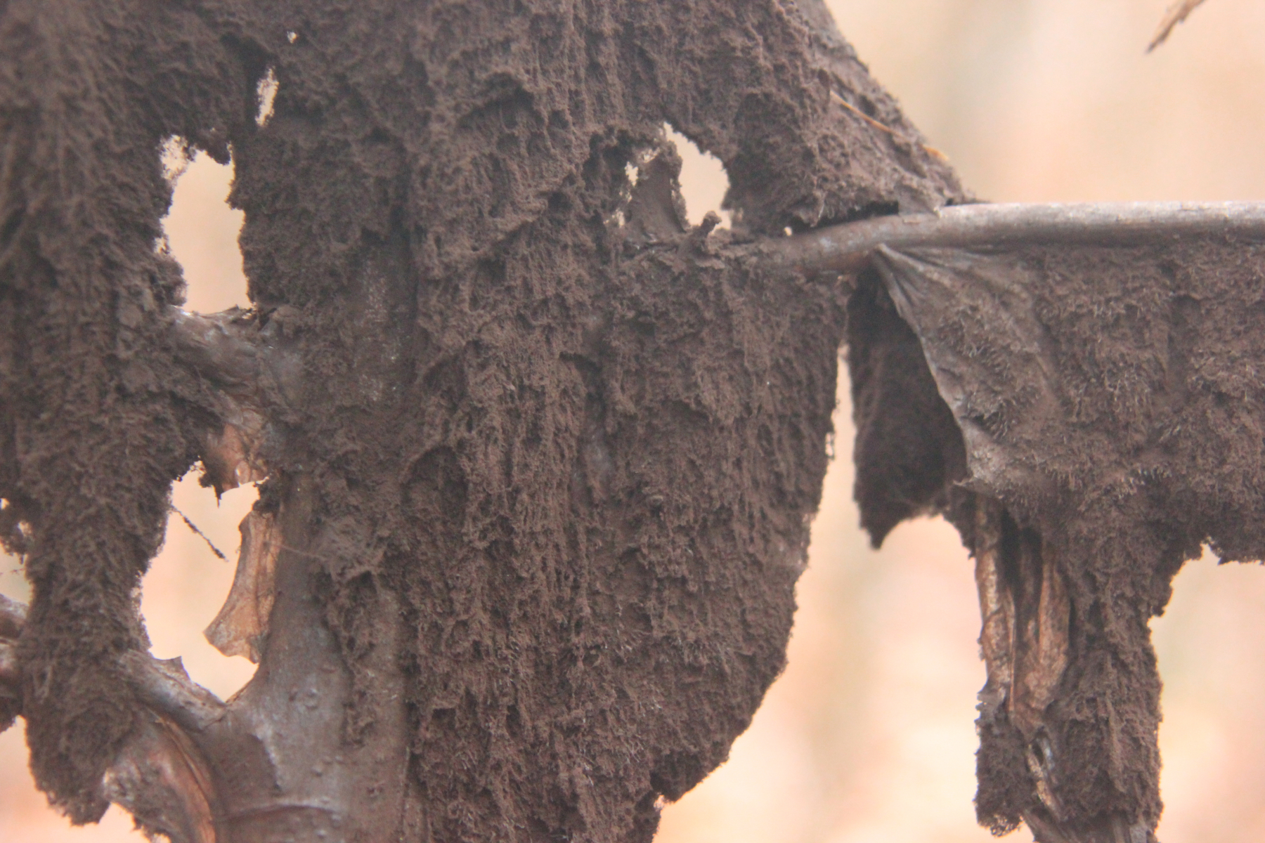 Man sieht schön die "Hautfetzen" die der Hypothallus (die hautartige Unterlage mit dem der Schleimi auf dem Substrat aufsitzt) des Schleimpilzes ist. Die herunterhängenden Strähnen sind das Capillitium (Fadengeflecht) an dem die Sporen haften.