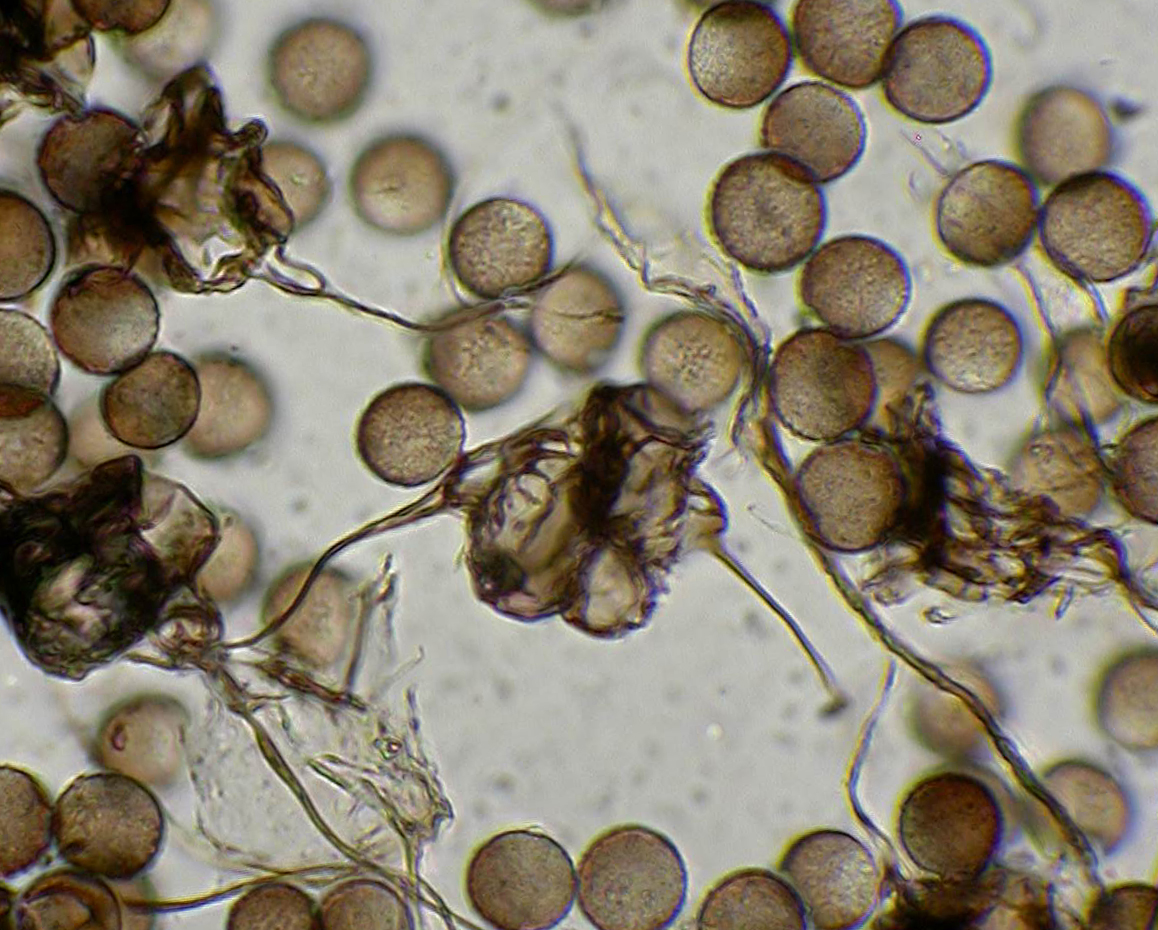 Brefeldia ist mikroskopisch gut durch die netzigen blasenartigen Erweiterungen im Capillitium zu erkennen. Auch die Sporen sind typisch, einseitig etwas heller, warzig und um 10um