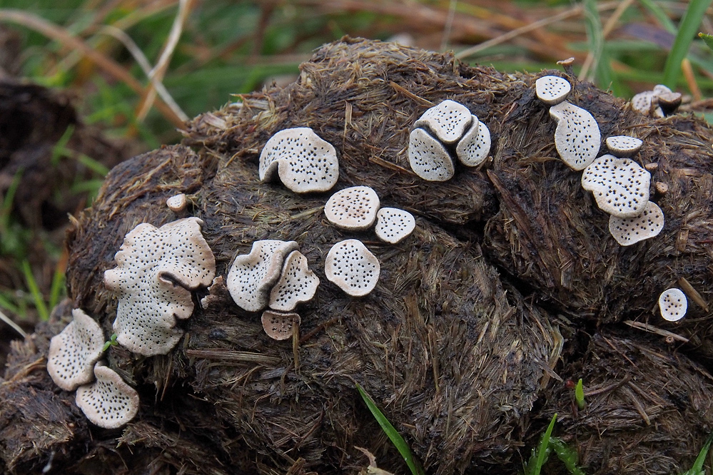bevor die ersten Bodenfröste die Pilzsaison im Offenland vorerst beenden, habe ich mich am letzten Sonntag noch zu einem kleinen Ausflug in die nähere Umgebung aufgemacht. Ziel war die Pferdeweide im NSG Moosheide, wo ich 2015 auf dem Dung der Senner Pferde die Punktierte Porenscheibe (Poronia punctata) entdecken konnte.