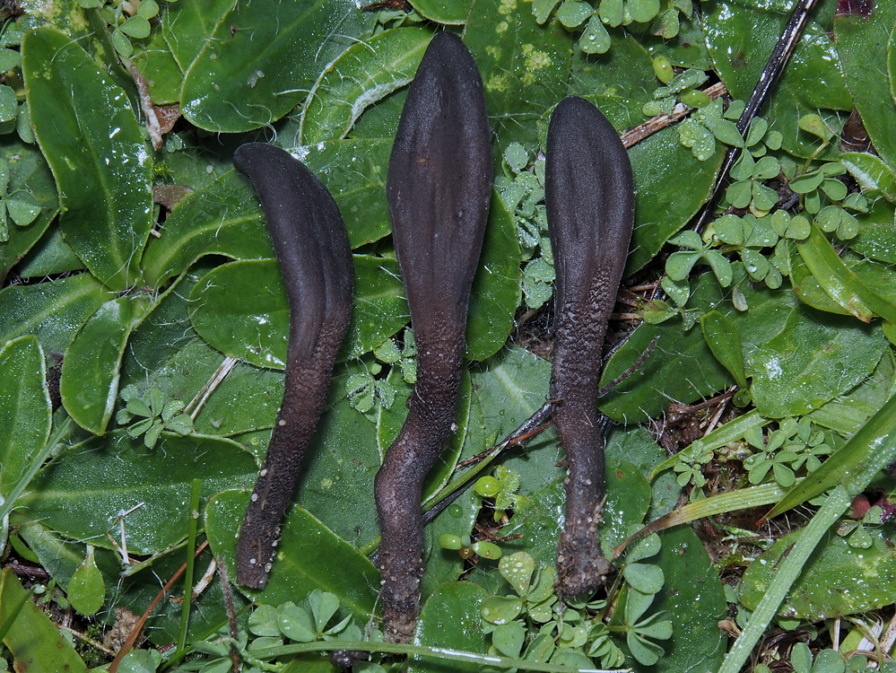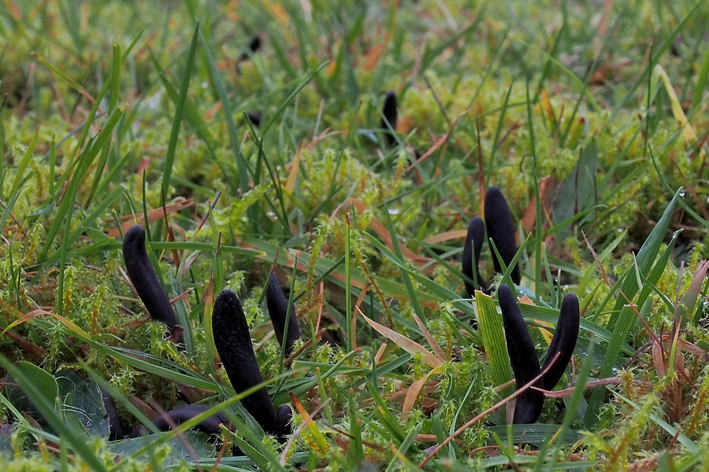 Ähnlich frisch wie die Frostschnecklinge sind auch noch die Erdzungen, die in großer Zahl auf der kurz gefressenen Weide zu entdecken sind. Es sind hier zwei Arten miteinander vergesellschaftet, zum einen die weit verbreitete und allgemein bekannte Schleimige Erdzunge (Glutinoglossum glutinosum) und zum anderen die in Deutschland lange Zeit verkannte Geoglossum elongatum, die mit ihrem geschuppten Stiel der Täuschenden Erdzunge (Geoglossum fallax) sehr ähnlich ist, aber wohl nur auf sehr basenarmen und sauren Sandböden siedelt, die wiederum von G. fallax gemieden werden.