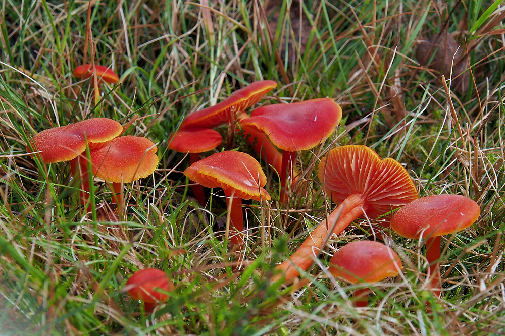 Zu den Charakterarten der Senne zählt auch der Mennigrote Saftling (Hygrocybe miniata). Die jetzt noch auf der Pferdeweide zu entdeckenden Exemplare waren aber alle schon ziemlich verwässert und farblos, hier deshalb ein Foto mit Exemplaren, die sich im Oktober (unter optimalen Bedingungen) entwickeln konnten.