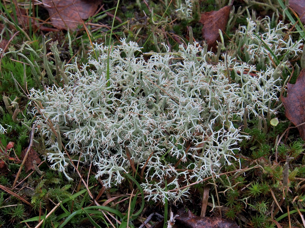 Bodenbewohnende Strauchflechten haben es auf einer Pferdeweide schwer und werden durch den Tritt der Tiere immer wieder stark geschädigt. Langfristig überstehen das nur wenige "robuste" Arten. Die besonders schönen, aber auch sehr zerbrechlichen Rentierflechten (eine kleine Artengruppe innerhalb der sehr vielgestaltigen und großen Gattung Cladonia) behaupten sich hier nicht. In einem kleinen Heiderest außerhalb des umzäunten Geländes standen aber einige Exemplare der in der Senne noch weit verbreiteten Ebenästigen Rentierflechte (Cladonia portentosa).