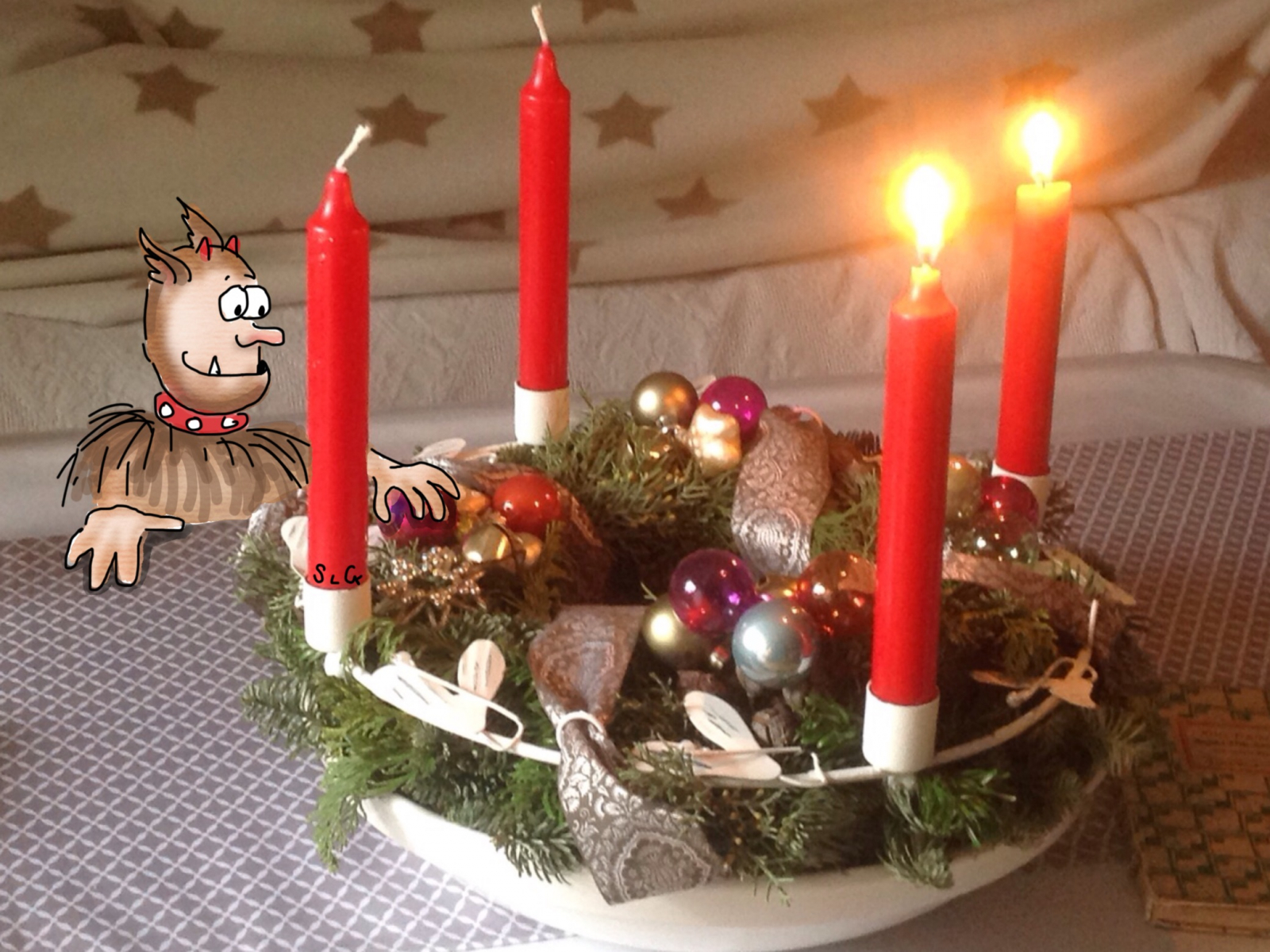 Gnolmi und ich hoffen, Ihr hattet einen schönen zweiten Advent. Wir haben es uns gemütlich gemacht und er hat mir auch beim Dekorieren geholfen.