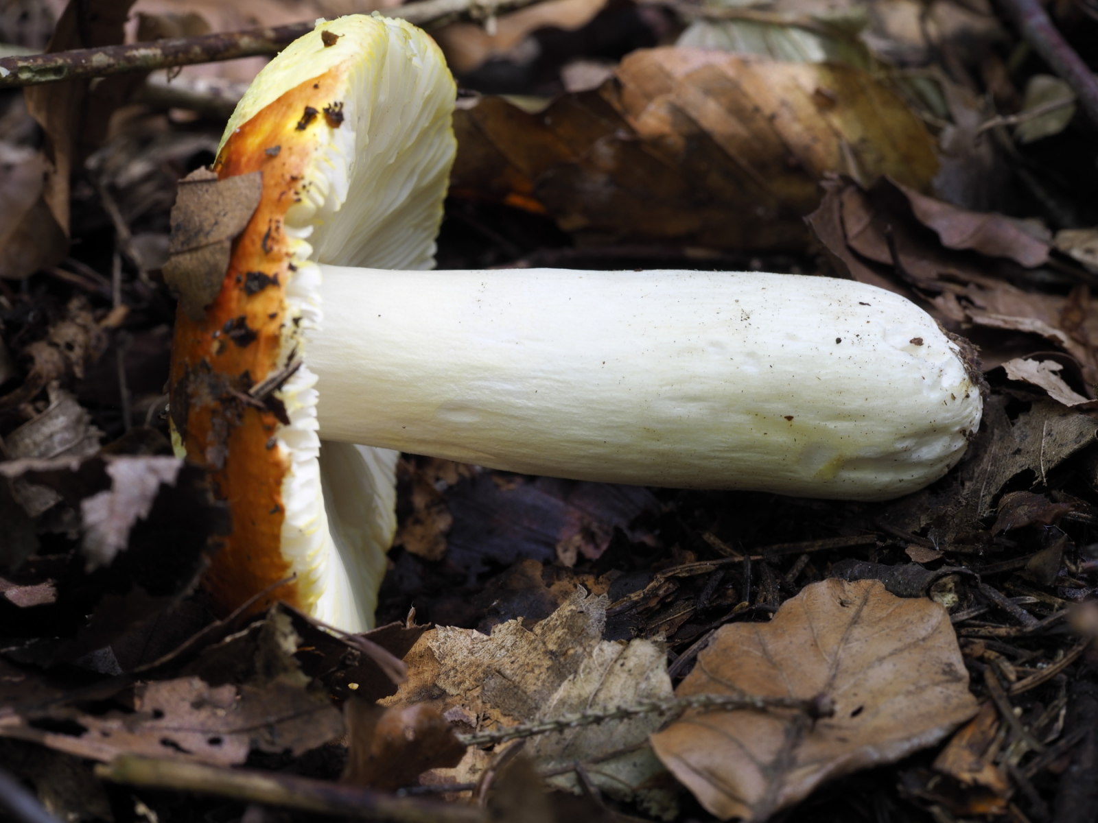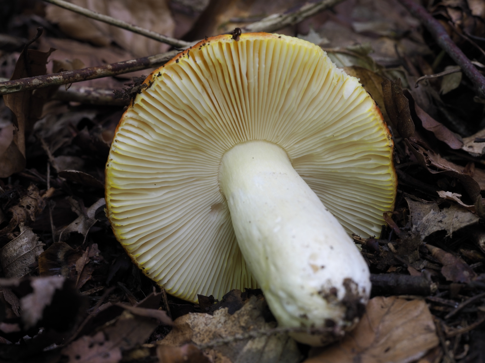 3) Lamellen gelb-ocker, tlw. Schneiden am Rand gelb, in Randnähe Y-Gabeln