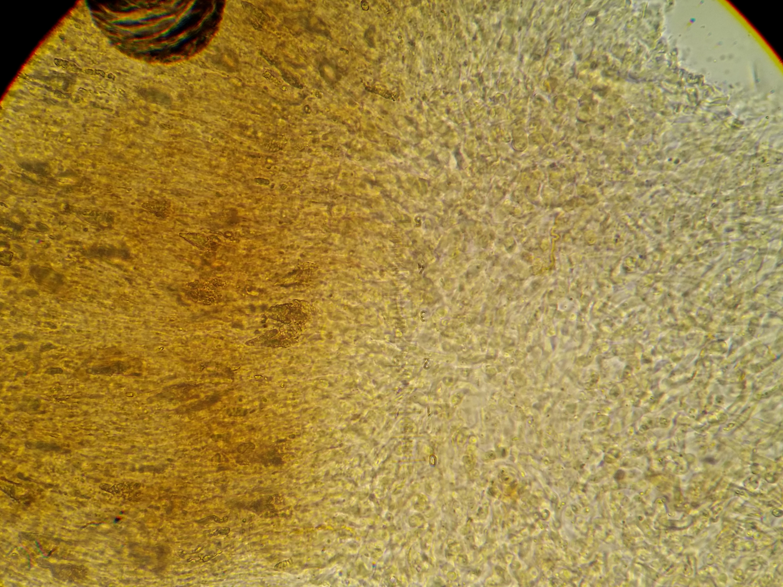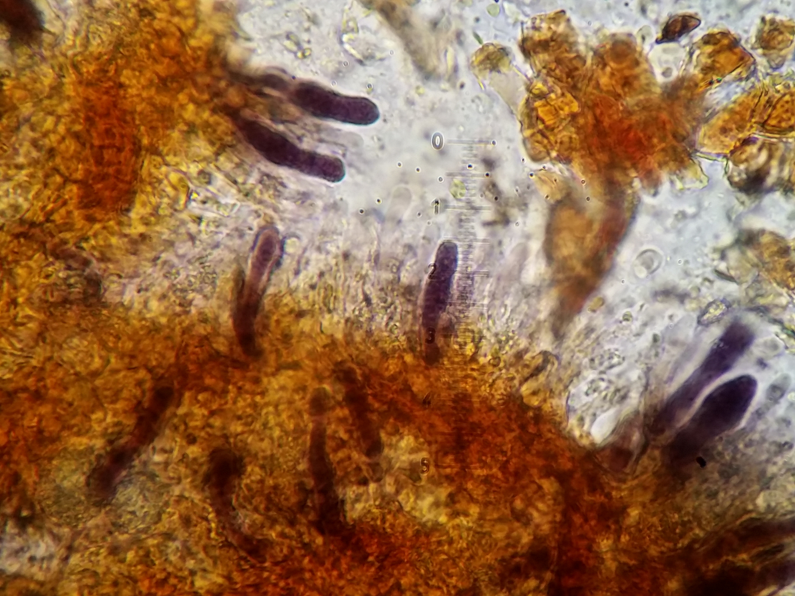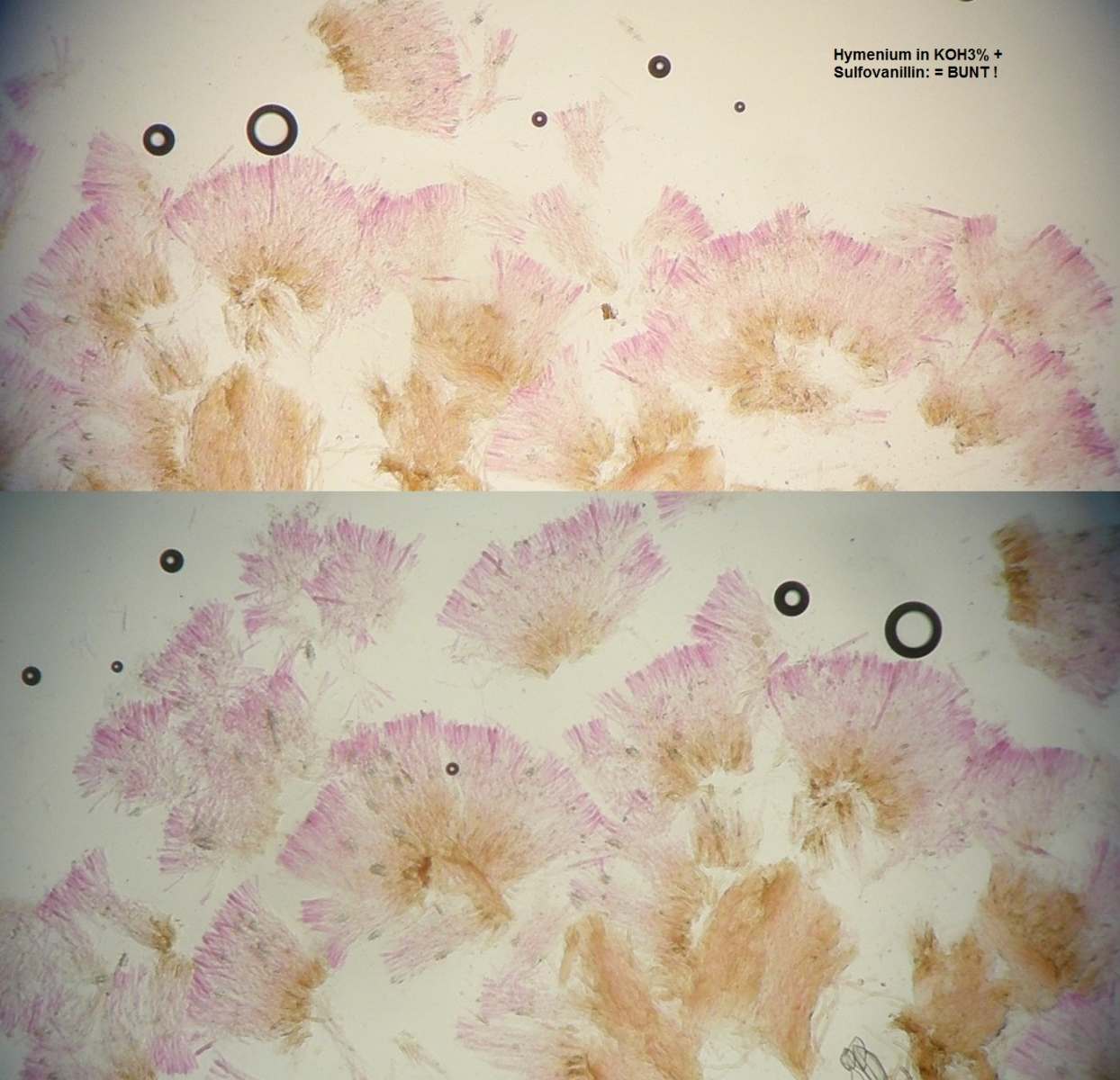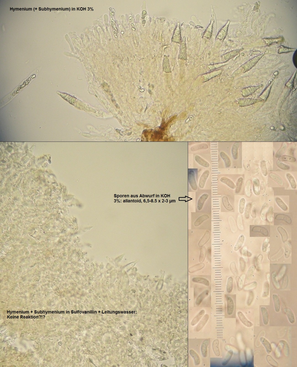 Die hat Gloeozystiden und Lamprozystiden, wuchs aber in meinem Fall an einem laubholz, das ich für Esche halte, und man sollte nicht den Fehler machen, den ich da gemacht habe: Sulfovanillin mit KOH kombinieren. Weil dann funktioniert die Reaktion nicht mehr so richtig. ;)