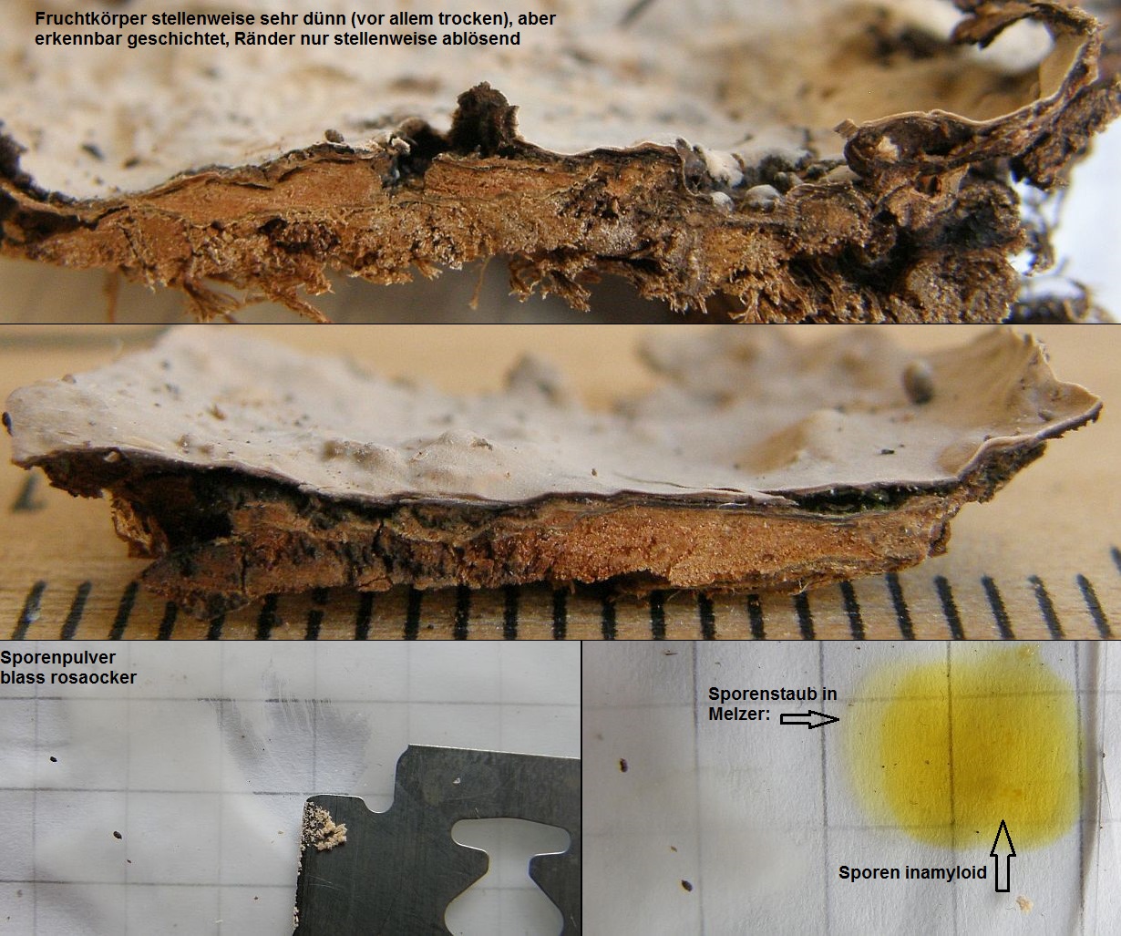 Die Schnallenanalyse ist bei Gloeozystidiellum s.l. eine nervige Geschichte, aber zum Glück sieht außer den beiden Megalocystidiums (lurium & leucoxanthum, mit Schnallen) nichts wirklich ähnlich aus und die beiden sind makroskopisch anders gefärbt und nur bei luridum sind die Sporen annähernd ähnlich, aber immer noch deutlich größer und länglicher.