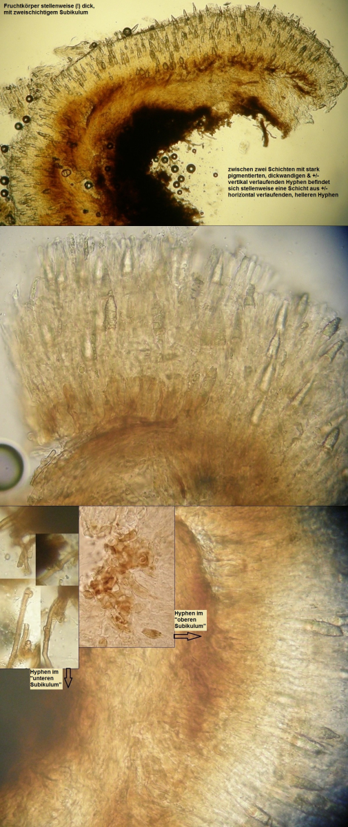 Hier Hymenium mit Lamprozystiden, Subhymenium aus dickwandigen Hyphen sehr sehr stark miteinander verwoben.