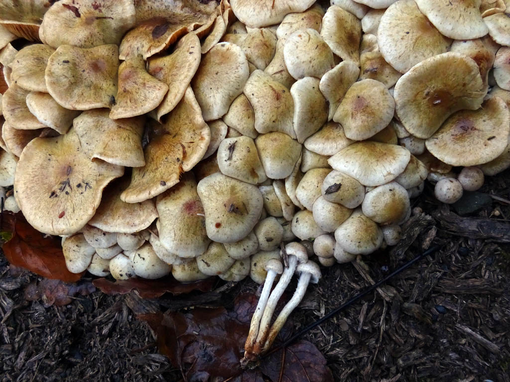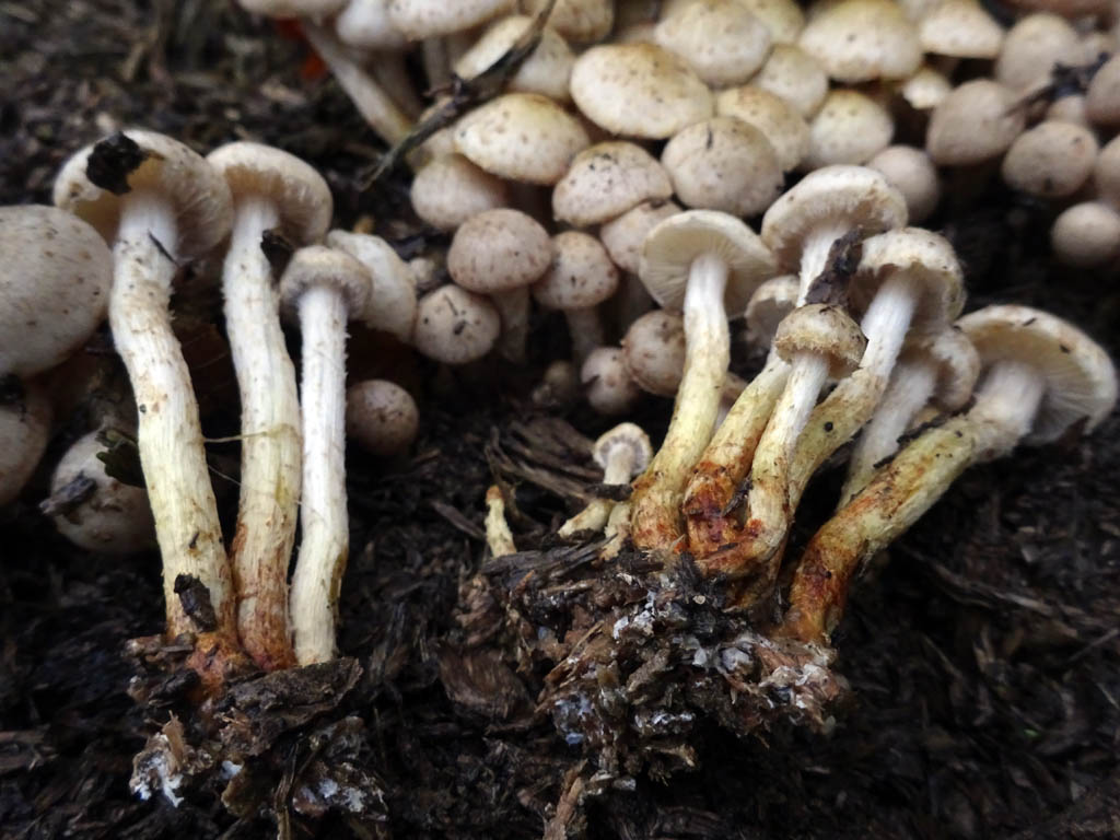 Holzhäckselplatz, üppige Büschel unterschiedlicher Altersklassen. Die jüngeren Frk noch mit hübschen Schüppchen auf schmierigem Hut und Stiel. Braunes SpP, also Schüpplinge.