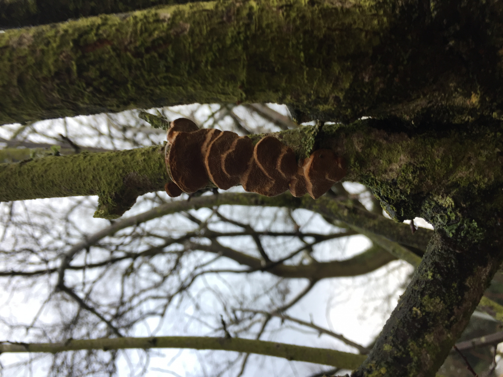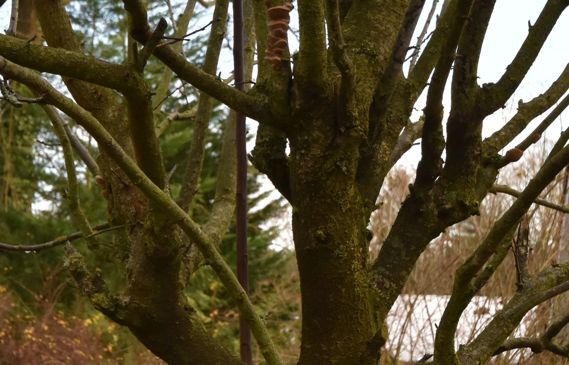 bei der Gartenarbeit habe ich heute an unserer Blutpflaume an drei Ästen den unten abgebildeten Pilz entdeckt. Leider sind die Bilder um 90 Grad gedreht.