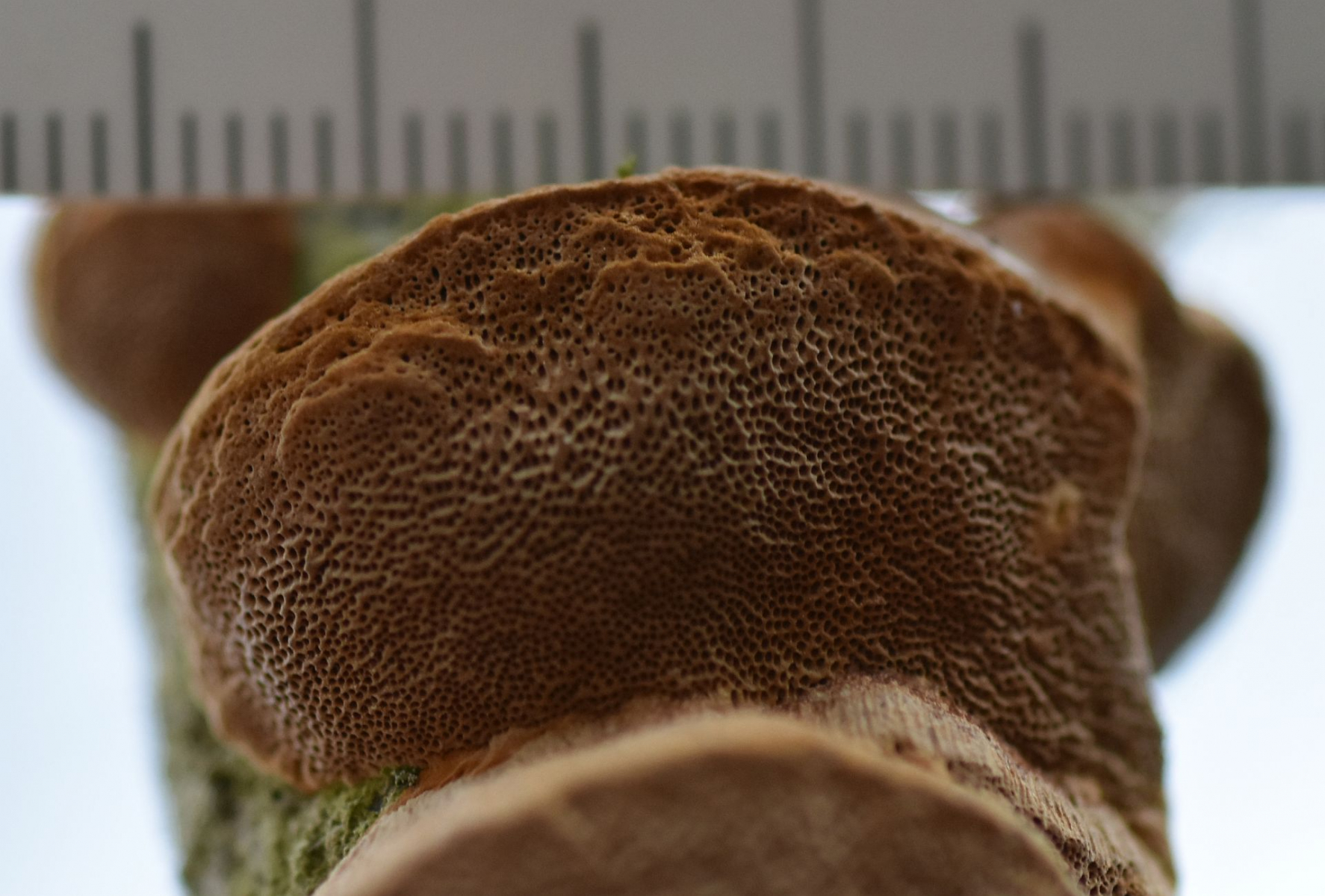 ein Tropfen KOH (3 %) würde den Zimtfarbenen Weichporling (der farblich besser als der Pfaumenfeuerschwamm passen würde) sofort schön violett verfärben und das Rätsel lösen.