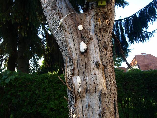 heute hab ich den pilz wieder gefunden, diesmal teilweise an alten stellen und über den abgestorbenen alten pilzkörpern, teilweise an neuen stellen auf der anderen baumseite und noch im schleimigen, weißen stadium.