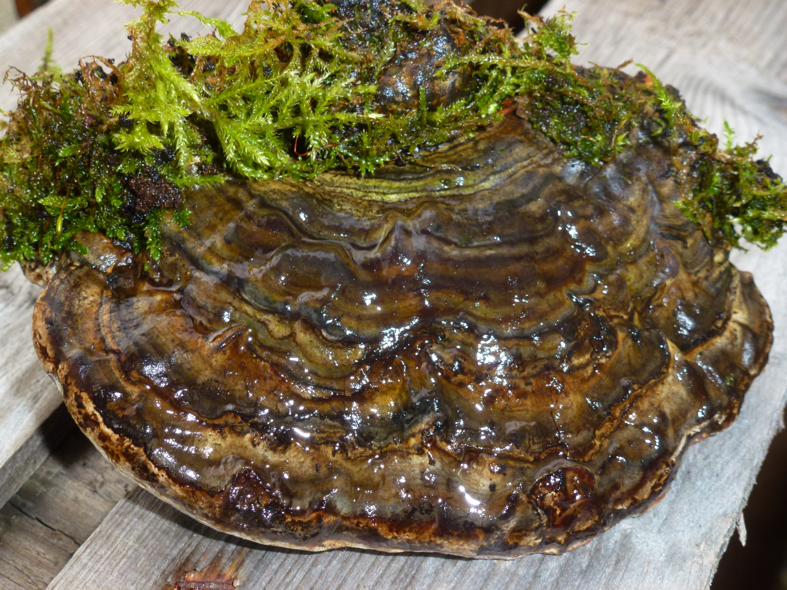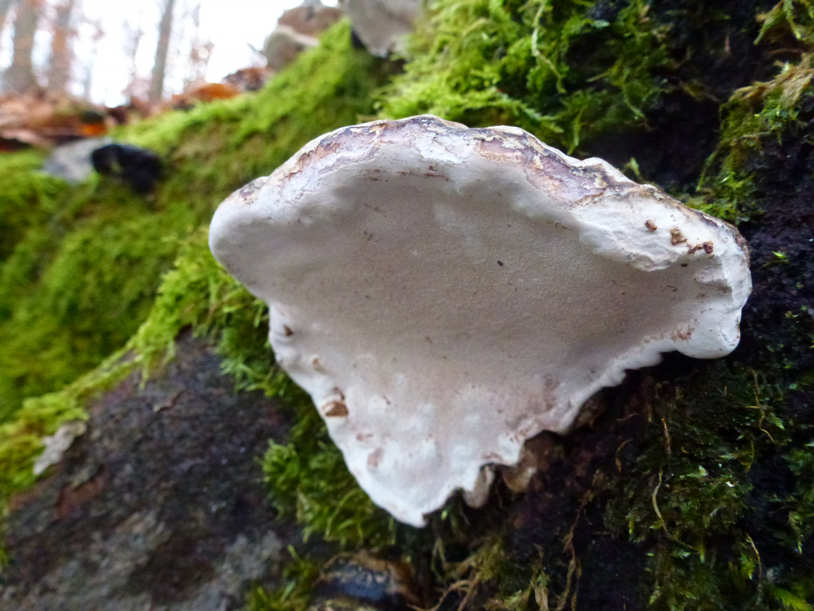 Außer einem >FomFom< wären noch ein >Flacher Lacki< möglich. Die wuchsform wäre für einen FomFom etwass ungewöhnlich, für einen Lackporling aber die Zeichnung der Oberseite. Ohne Pilz in Hand mag ich mich da nicht festlegen. Man kann natürlich auch warten, bis eine Sporulationsphase einsetzt (könnte aber bis März dauern), und dann gucken, ob das Sporenpulver weiß oder braun ist.
