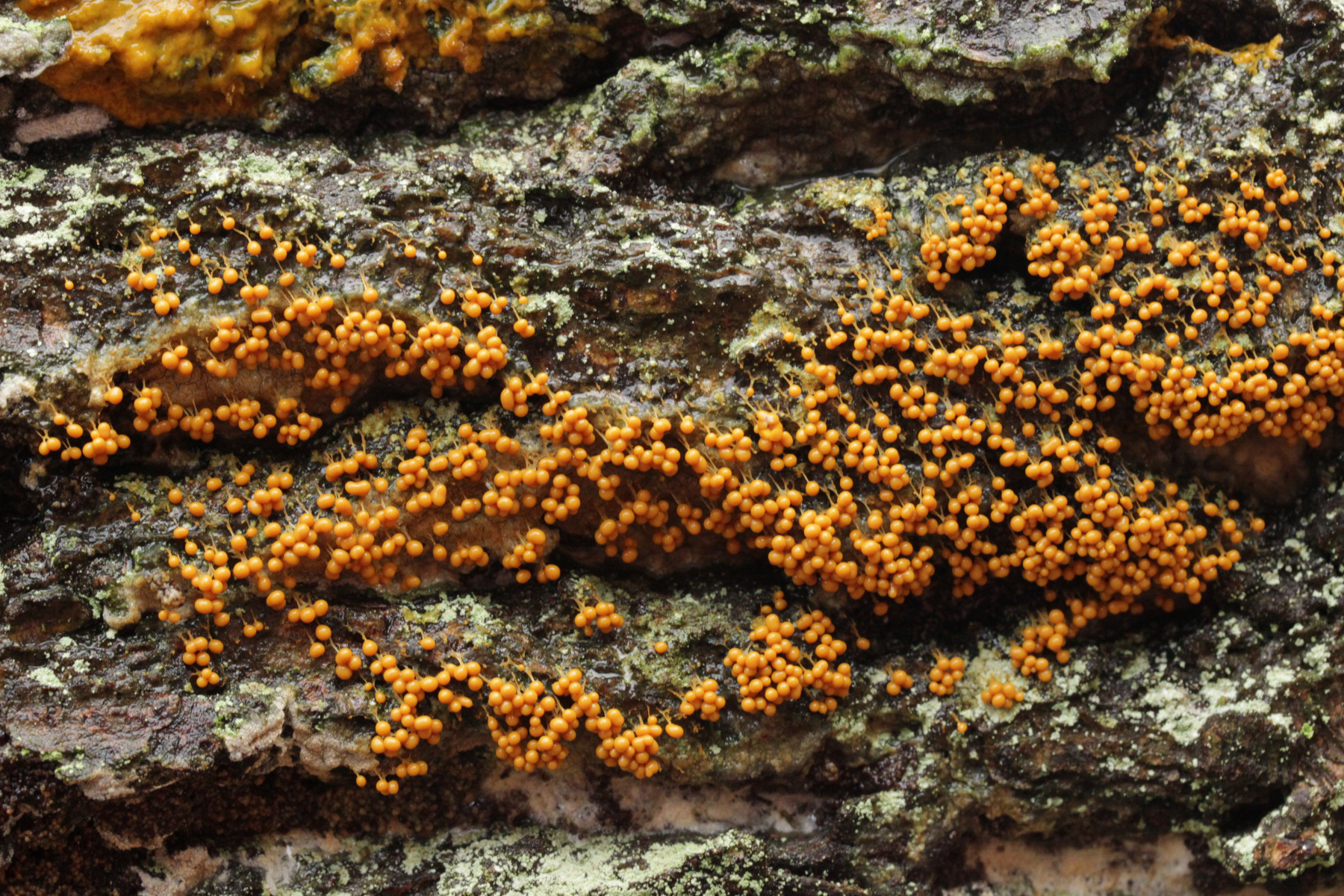 7. Tremella mesenterica. Schichtpilze als Futter waren weit und breit nicht zu sehen, aber Peniophora quercina war an den Ästen jeweils vorhandens, so daß ich T. aurantia ausschließen möchte.