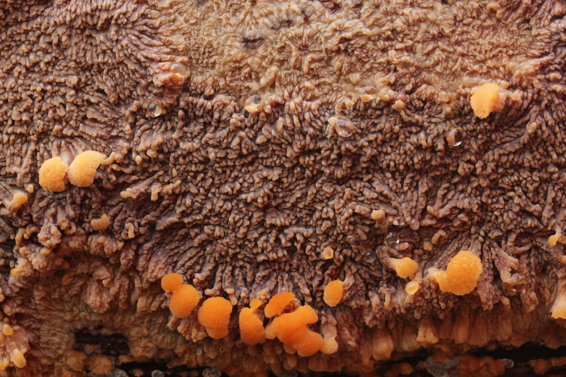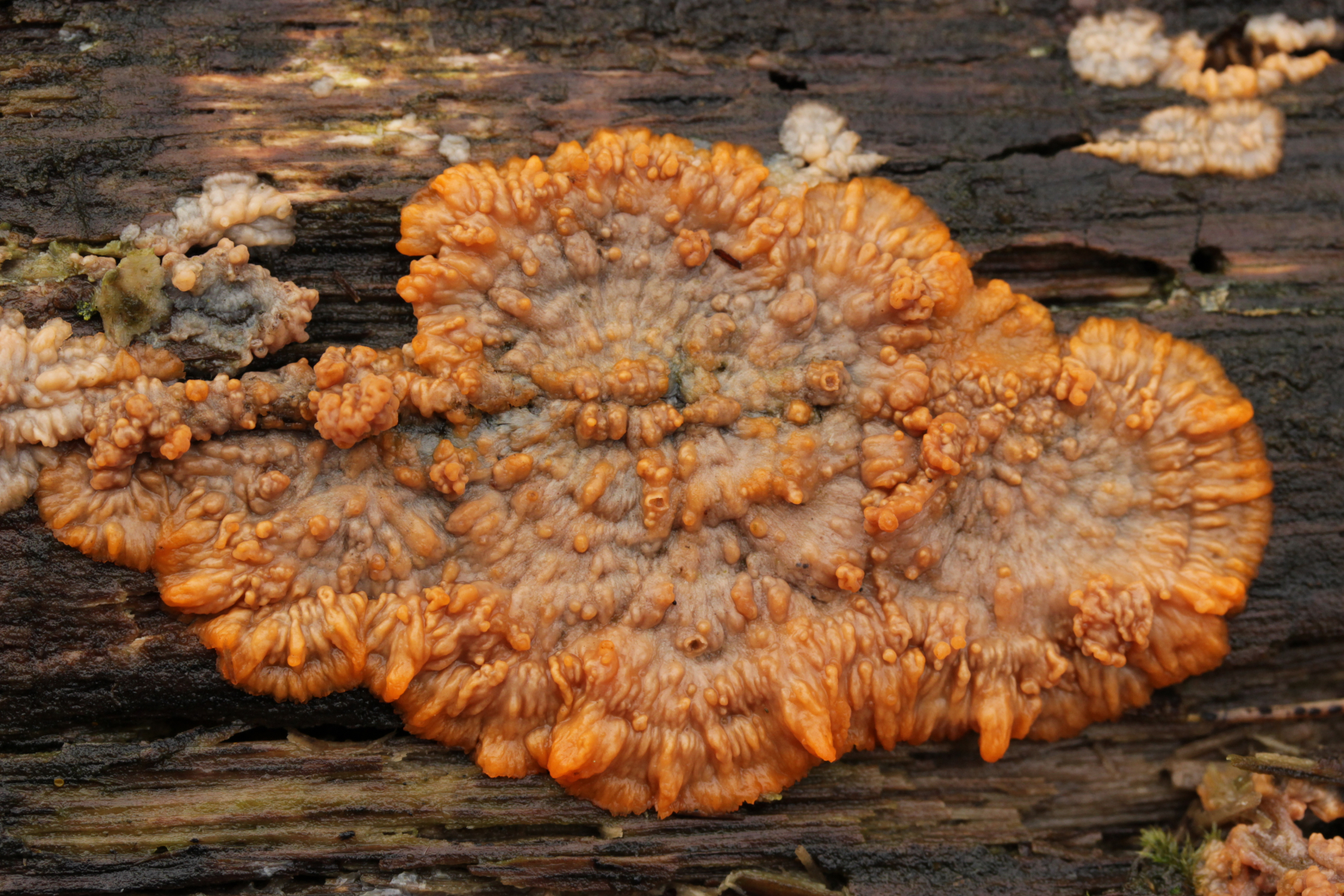 Die Bilder von Phlebia radiata sind hervorragend. Vor allem die, mit den eher blassen Fruchtkörpern, die dafür mit grell orangenen Puscheln bestückt sind.