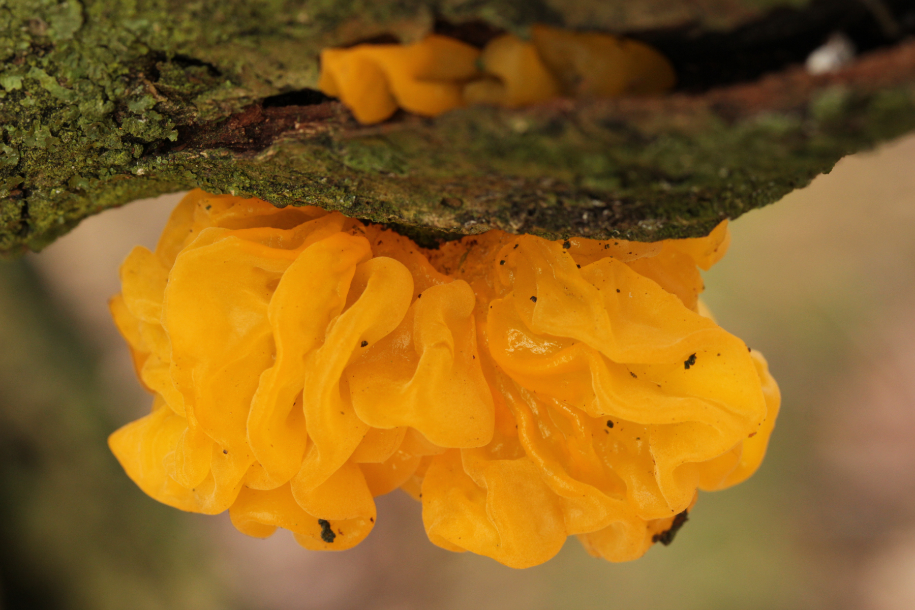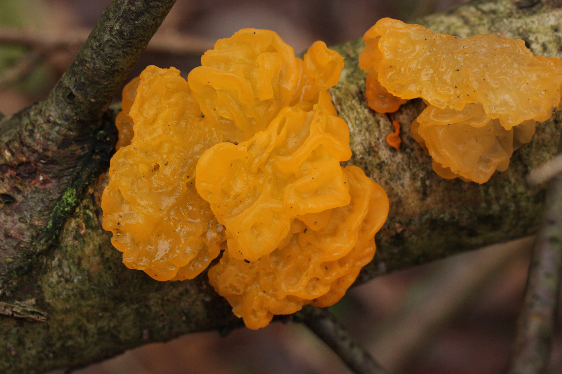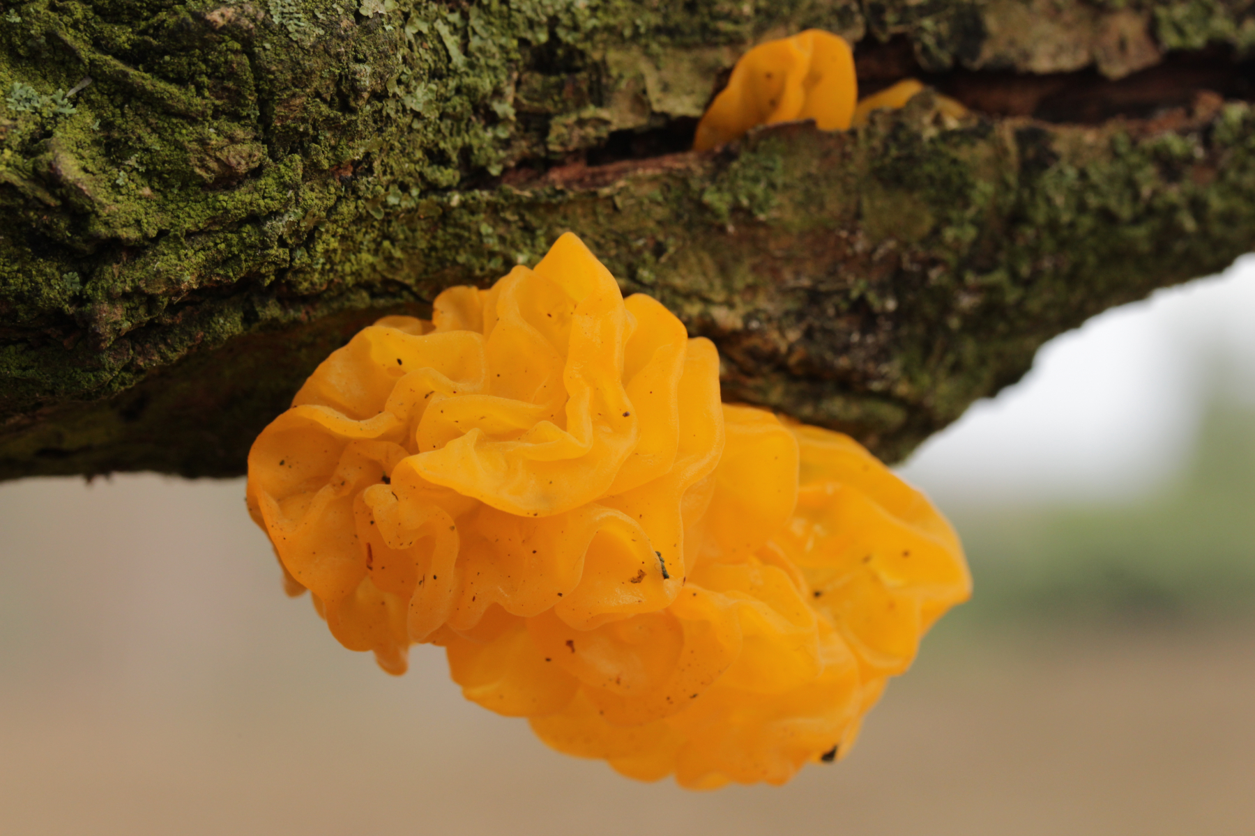 7. Tremella mesenterica. Schichtpilze als Futter waren weit und breit nicht zu sehen, aber Peniophora quercina war an den Ästen jeweils vorhandens, so daß ich T. aurantia ausschließen möchte.