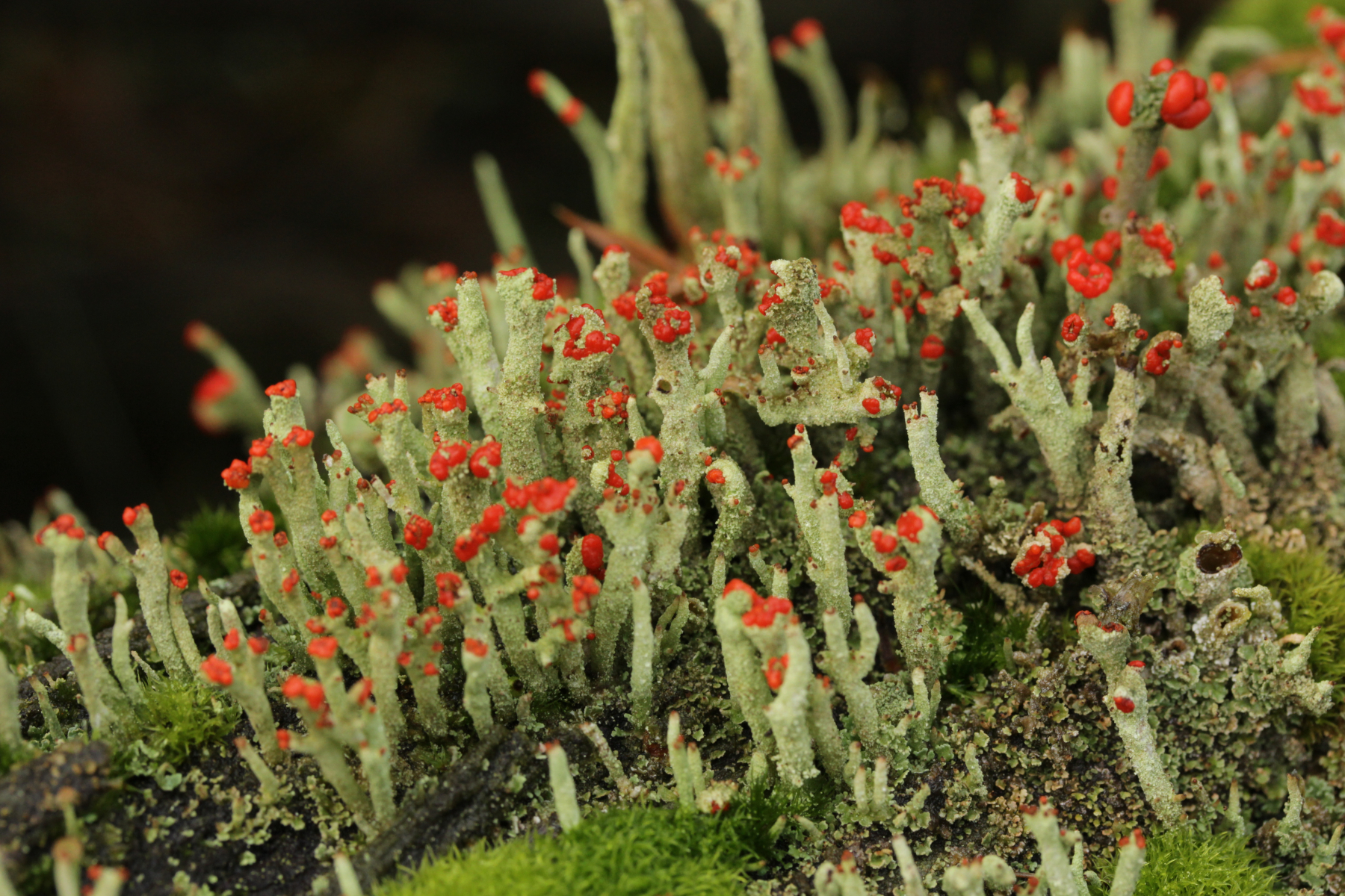 "Blühende" Cladonien sind stets ein Blickfang. "Blühend" ist natürlich das falsche Wort, im grunde ist das ja die Fruchtkörperbildung, wenn mich nicht alles täuscht. Also Apothecien, in denen eben Asci gebildet werden.