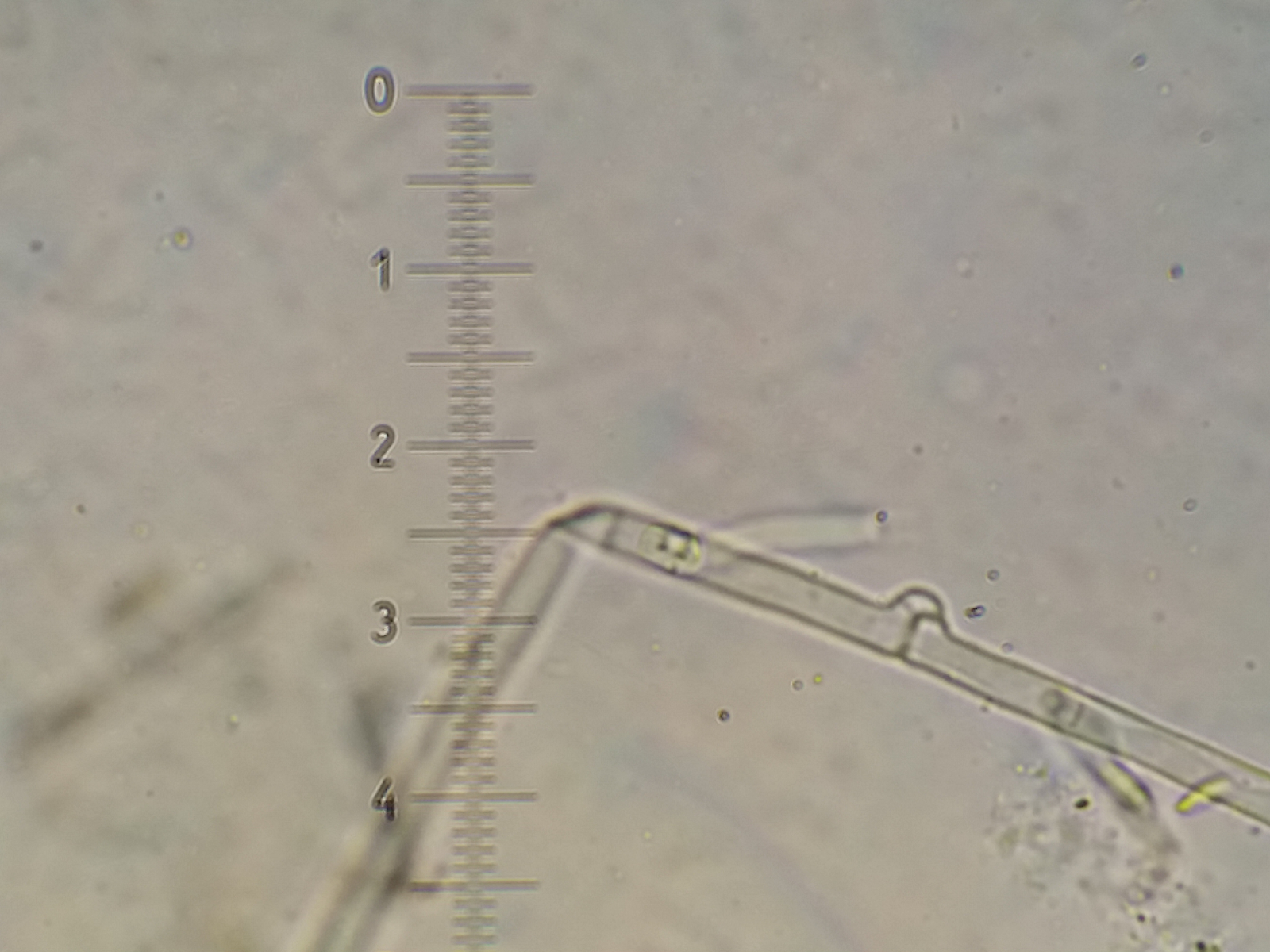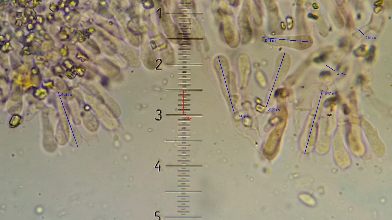 Mein Fehler, warum die zweite Doku unvollständig ist: Nein gemessen habe ich nicht die Hyphen direkt an der Basidienbasis, sondern etwas tiefer im Sunhymenium. Das wären die auf dem zweiten Bild im mittleren Teil. Die Hyphen direkt an der Basidienbasis sind im Bild schwer nachzumessen, weil zu undeutlich dargestellt. Bei weiteren Kollektionen werde ich auch das im Auge behalten. :thumbup:
