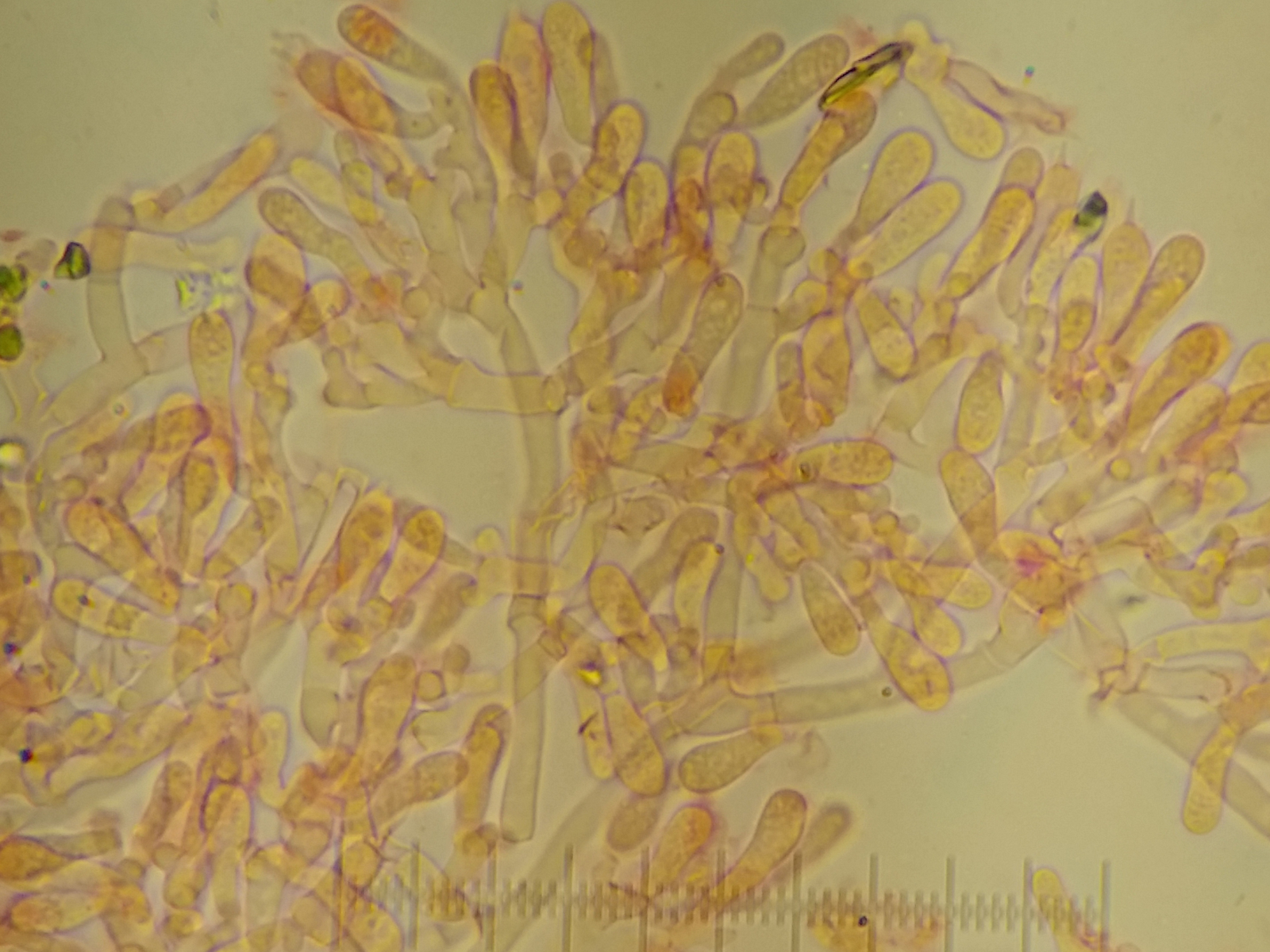 Die Basidienmaße wären kurz, was hier ja mal passen würde (interessant wäre, den Fruchtkörper mal reif zu sehen und dann wieder die Basidienmaße zu prüfen).