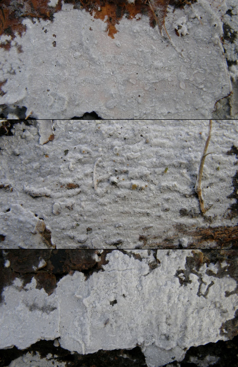 Fruchtkörper weißlich bis hell grau bis hell cremefarben, das Substrat mehrere Zentimeter weit überziehend, dünn häutchenförmig, der Unterlage dicht aufliegend, Subiculum wenig entwickelt, Fruchtkörperrand allmählich ausdünnend, leicht ablösbar.