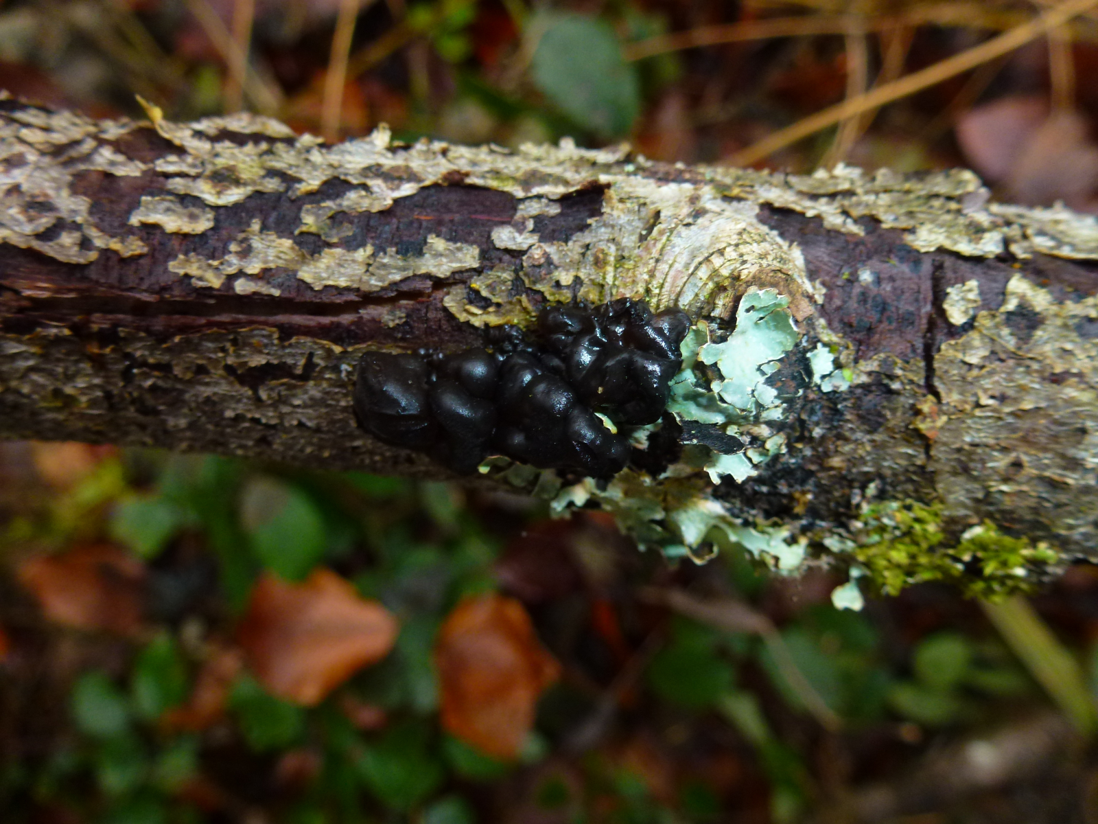 Der zweite ist pechschwarz und zeigt die typischen Drüsenpunkte auf der Oberfläche. Folglich Exidia nigricans (= Exidia plana).