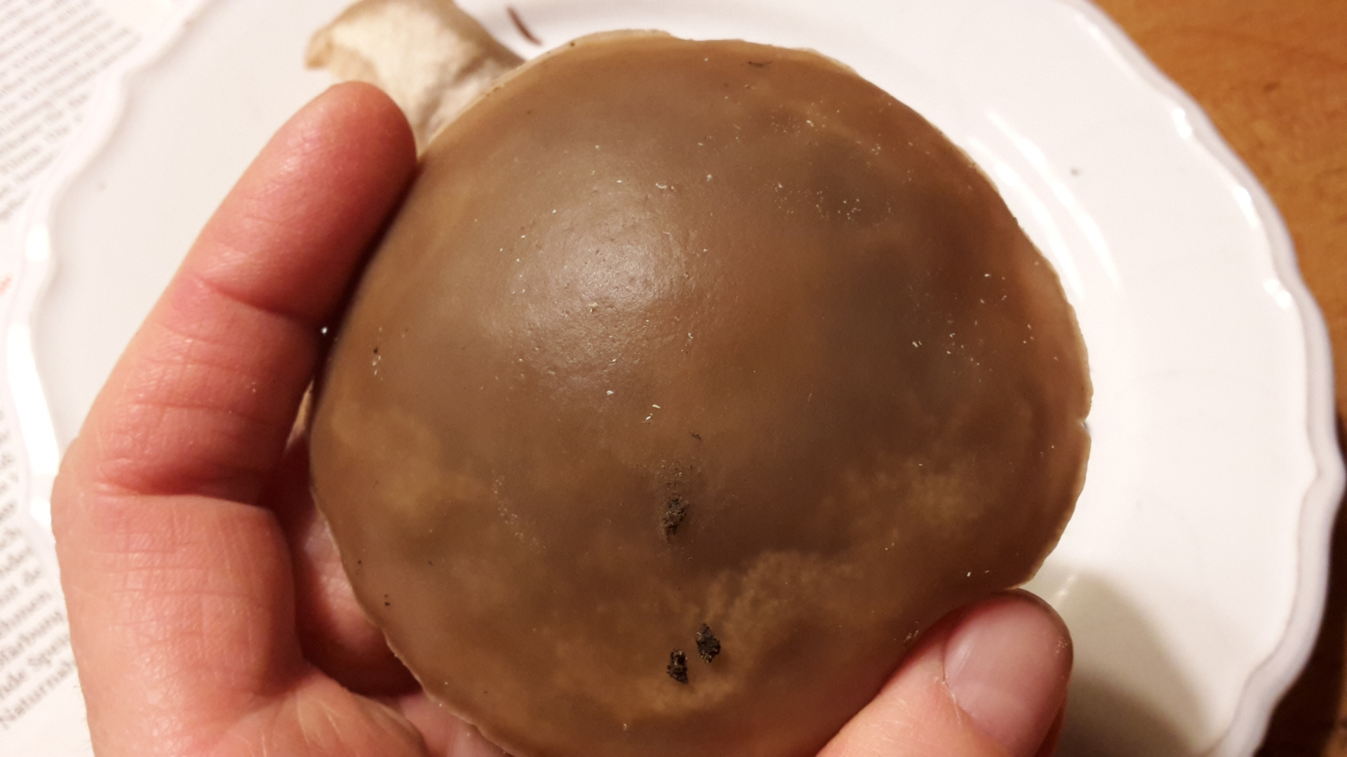 Lamellen entfernt stehend und untermischt, beige-grau, ausgebuchtet, Rand ganz leicht eingerollt,