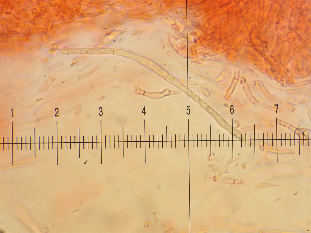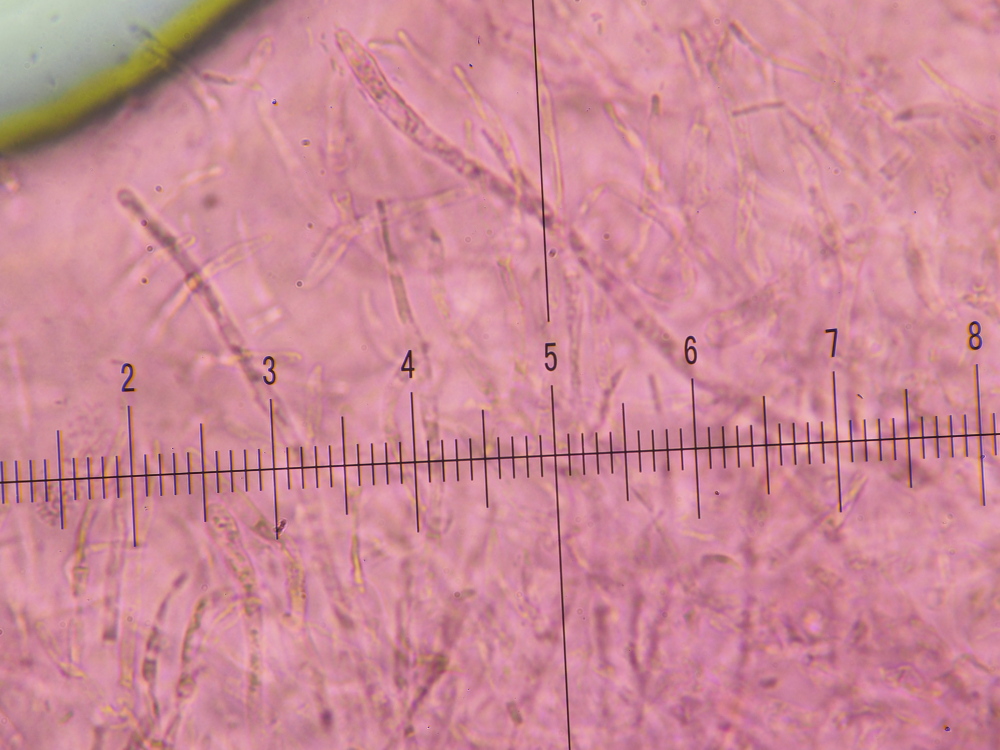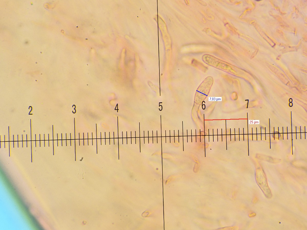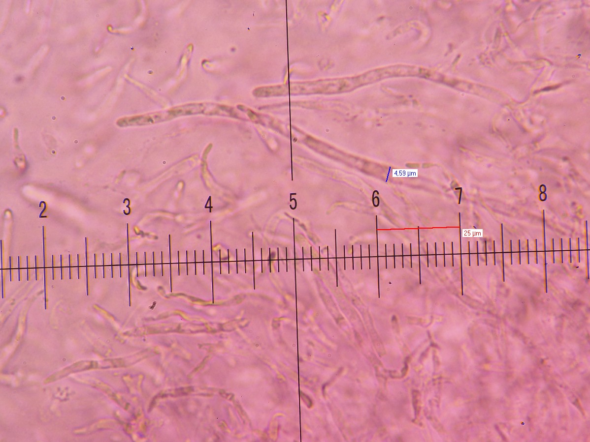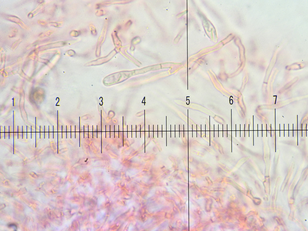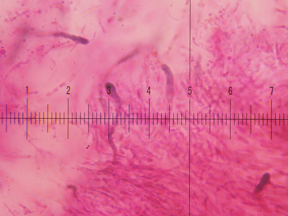 HDS Pileozystiden: vorhanden, keulig, zylindrisch-kopfig, teils inkrustiert, 1x septiert, 7 µm breit, violette Färbung in Sulfovanillin
