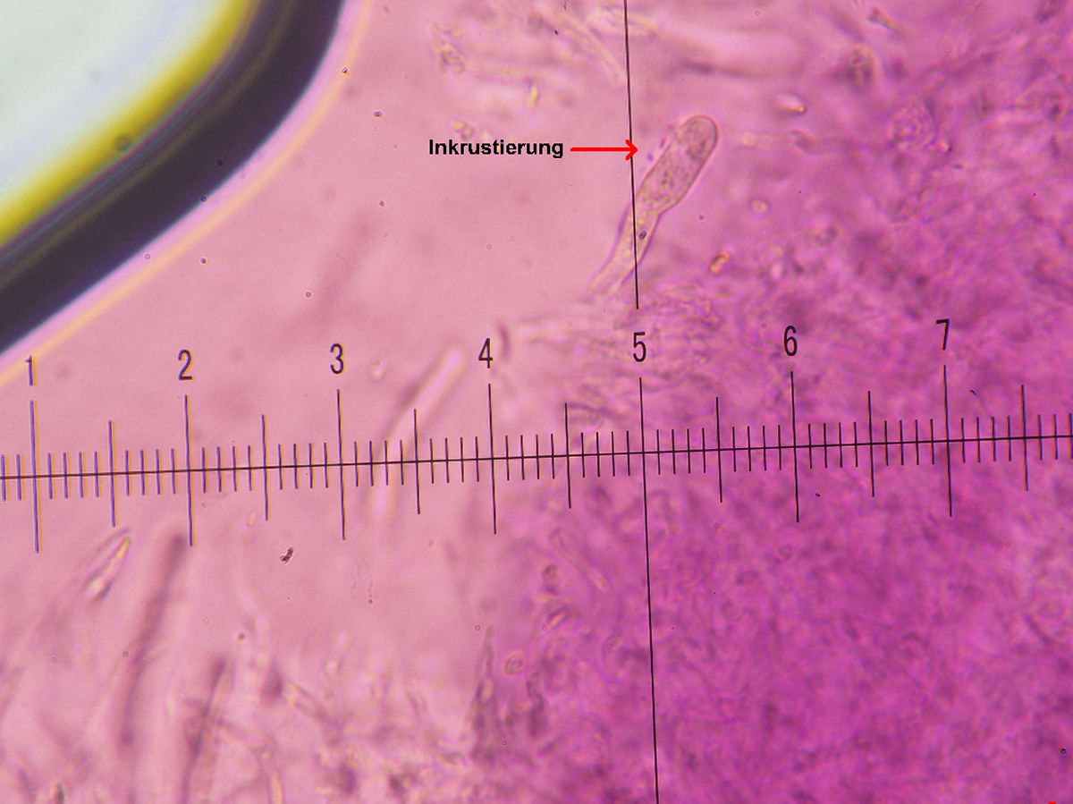 Die mikroskopische Nachprüfung der HDS und der Sporen zeigen auch alle geforderten Merkmale für R. integra inkl. Inkrustierungen der DZ