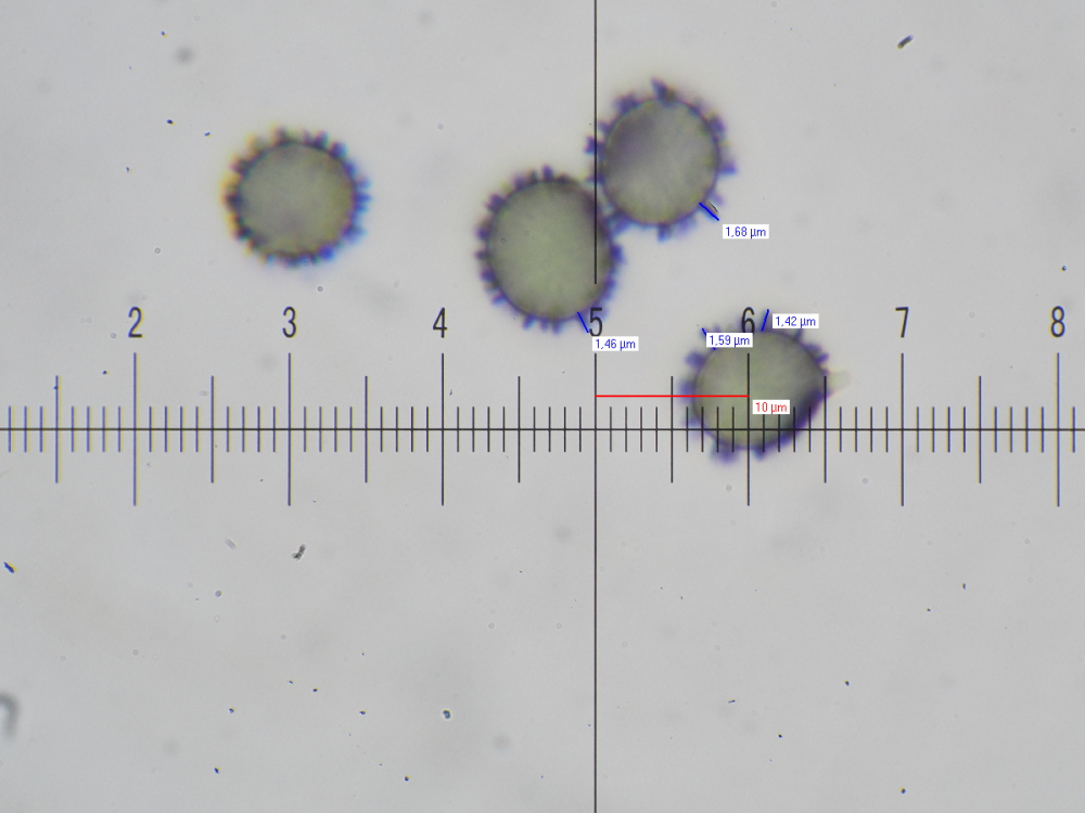 18) 1000x, Melzer, Warzen lang-stachelig, meistens um 1,5 µm, manche bis 1,8 µm