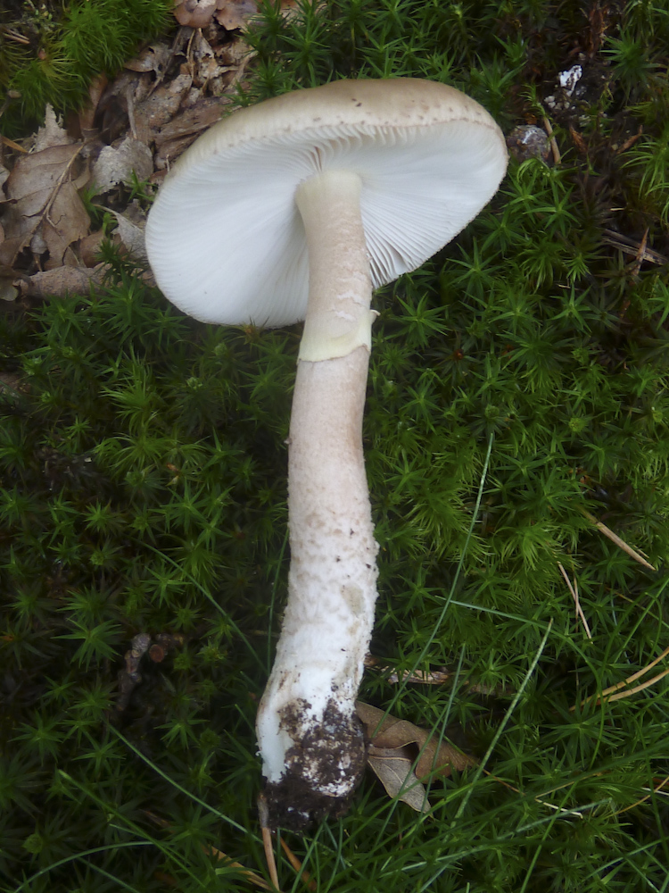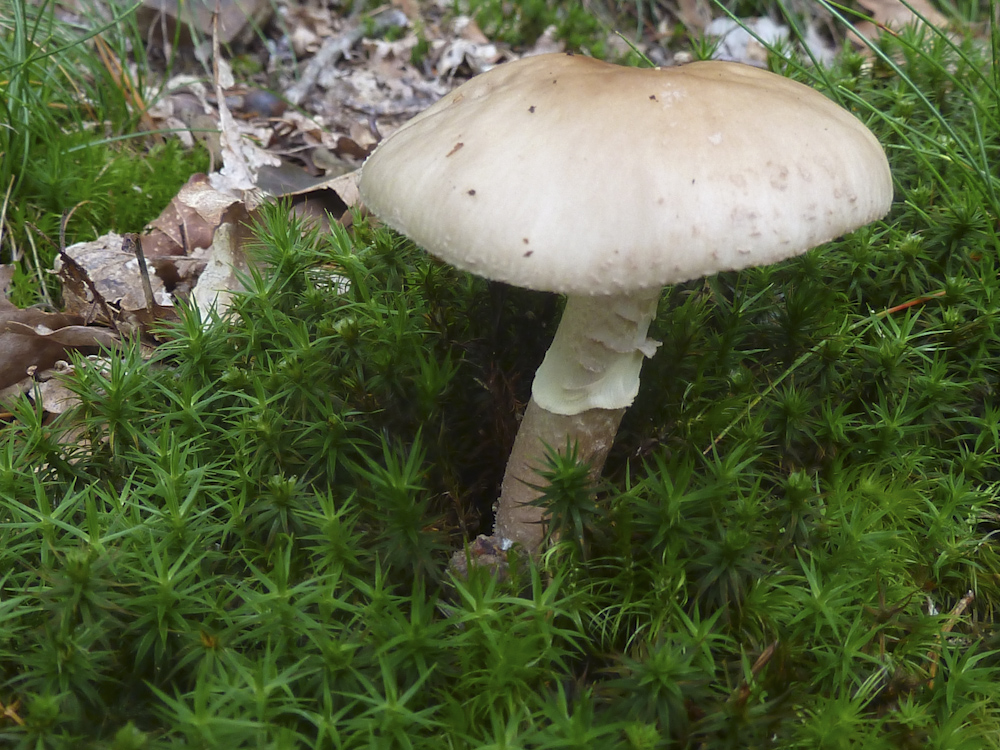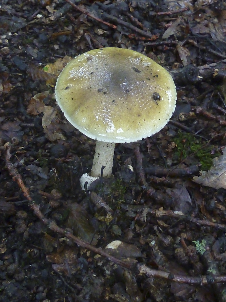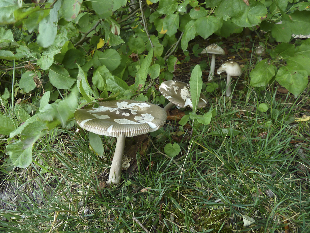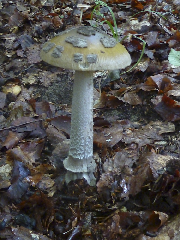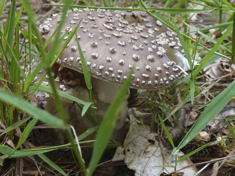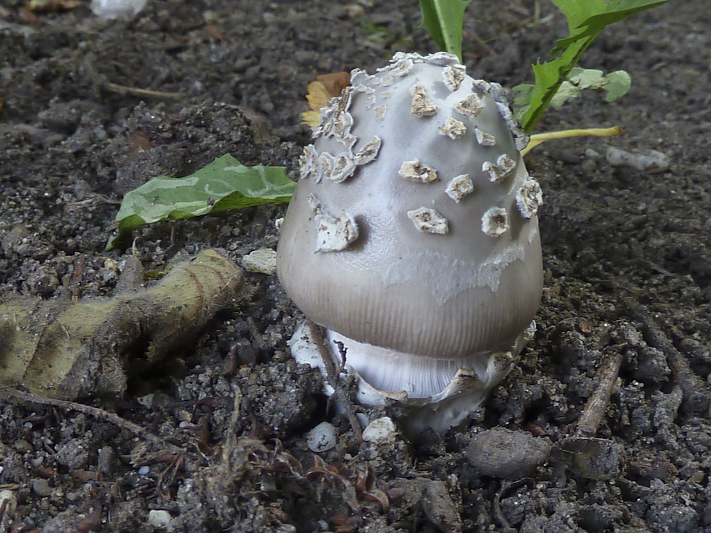 Und der hier ist zwar auch grau, hat aber ziemliche große Schollen (Hüllreste) auf dem Hut:
