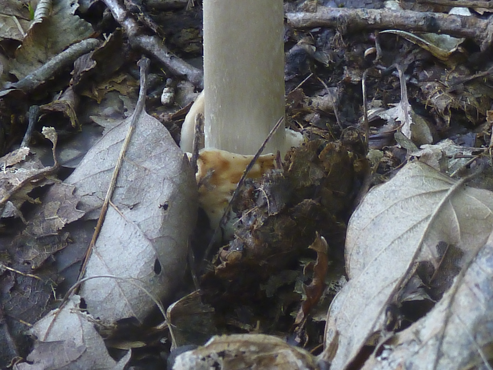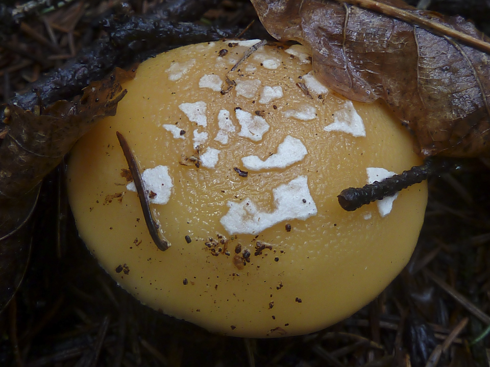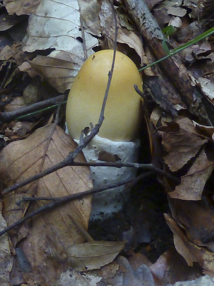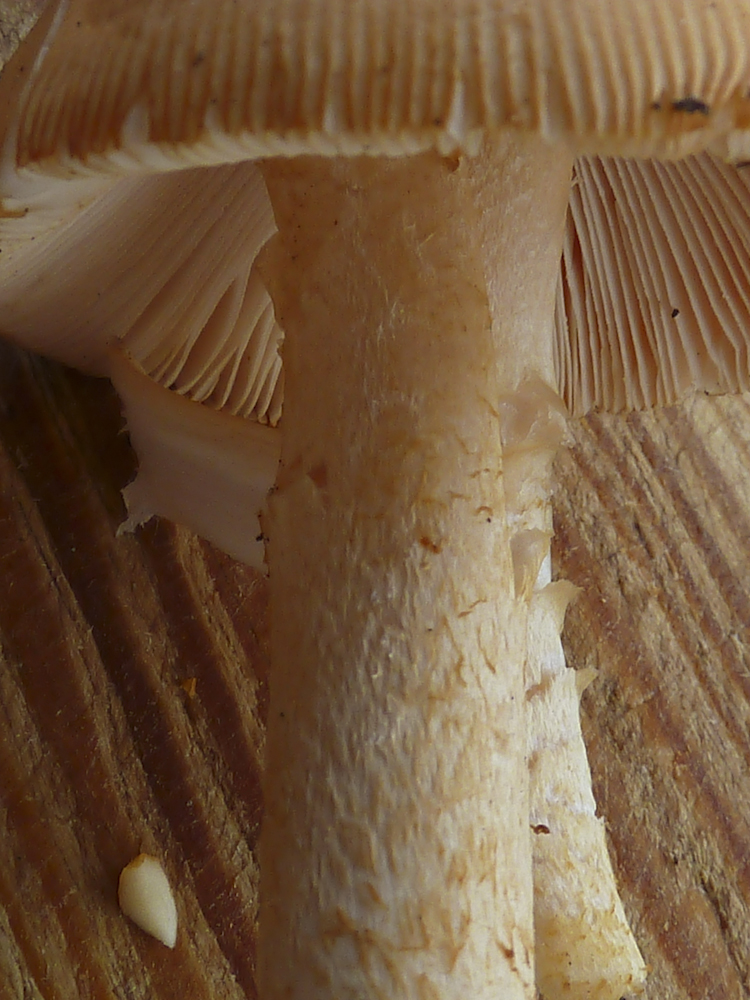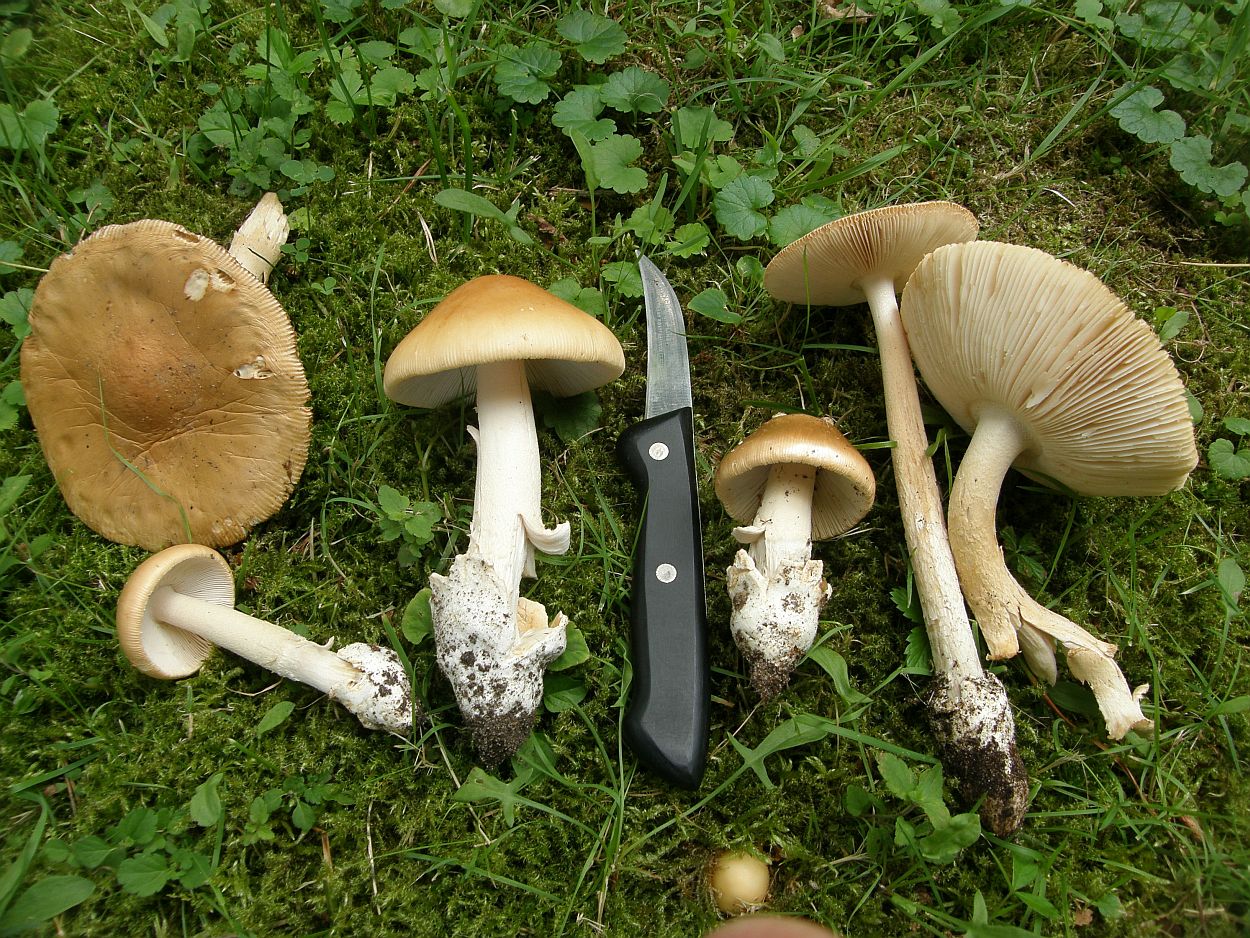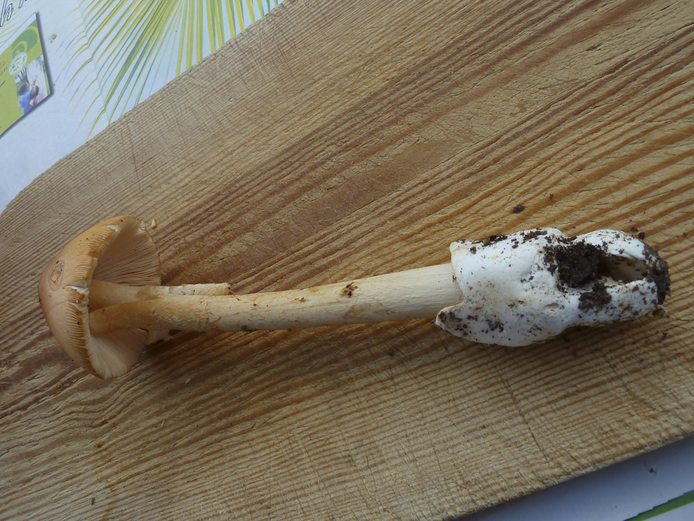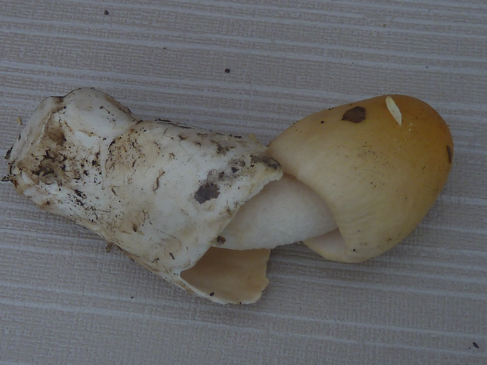 Hm, nun ist da ja doch eine Natterung zu sehen bei dem Scheidenstreifling. Aber da habe ich ohnehin noch ein Erkenntnisdefizit: Wo nämlich liegt die Grenze? Wie viel Natterung darf eine Amanita subnudipes oder eine Amanita flavescens haben, im vergleich zu einer "richtigen" crocea? Also muss der Stiel wirklich glatt sein? Oder ist schon alles, was nicht deutlich farblich kontrastierend genattert ist, schon keine crocea mehr? Letzteres kann ich mir eigentlich nur schwer vorstellen, aber dazu müsste man die beiden anderen Arten eben besser kennen, nicht nur aus drei Kollektionen von einem Fundort...