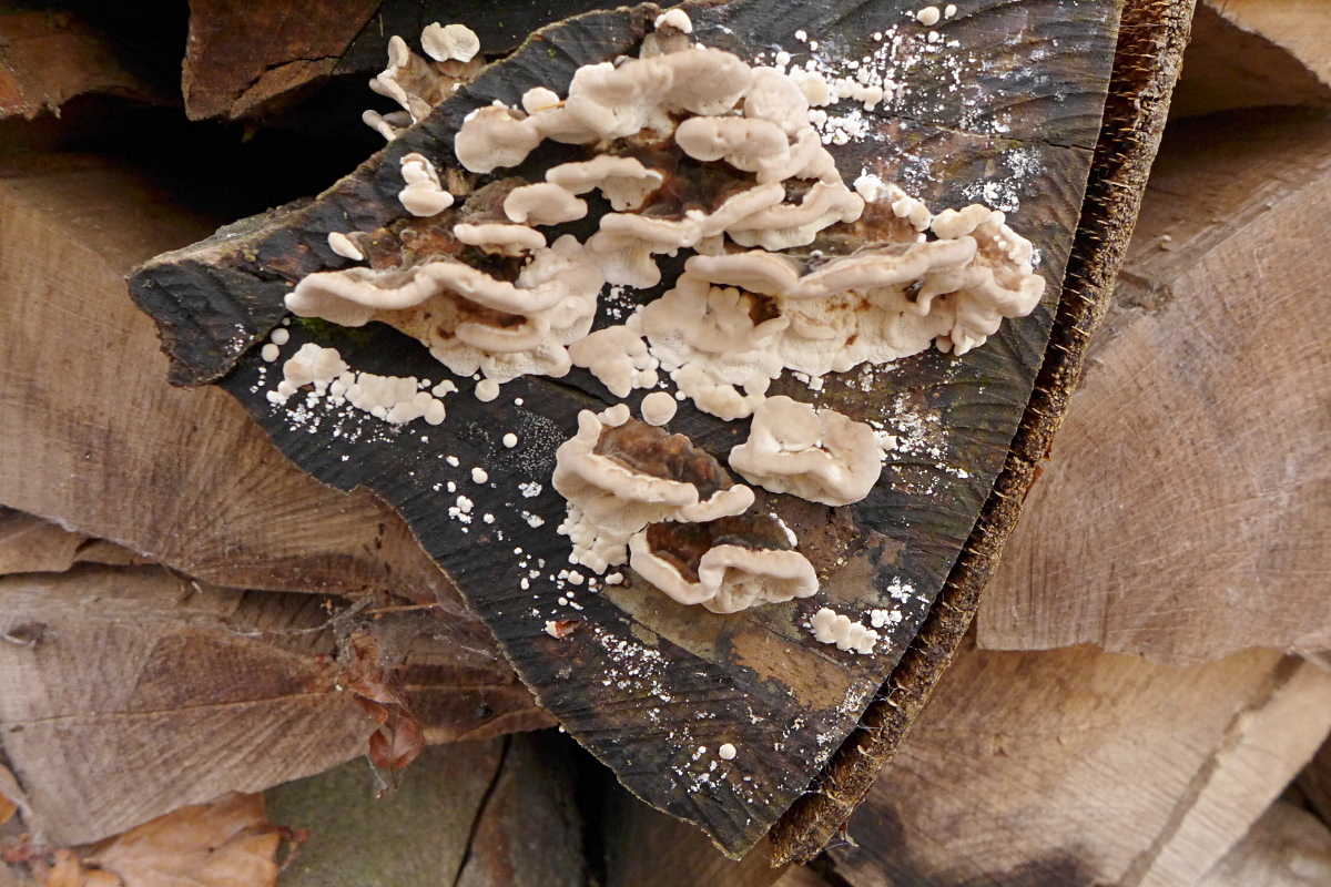 Austernpilze mit Ablösendem Rindenpilz und Zinnoberrotem Pustelpilz