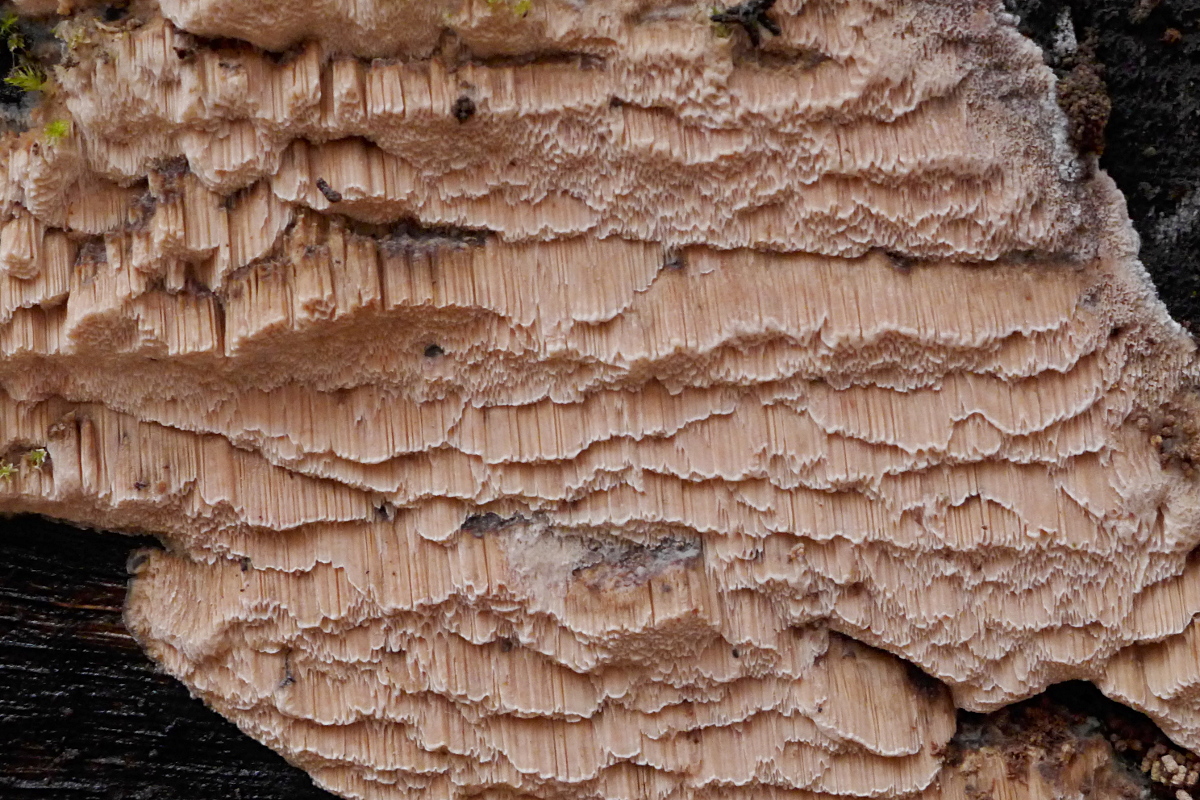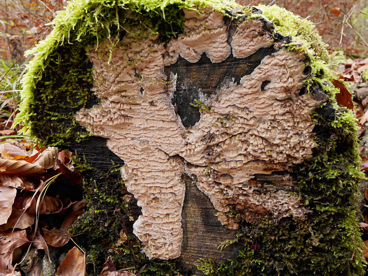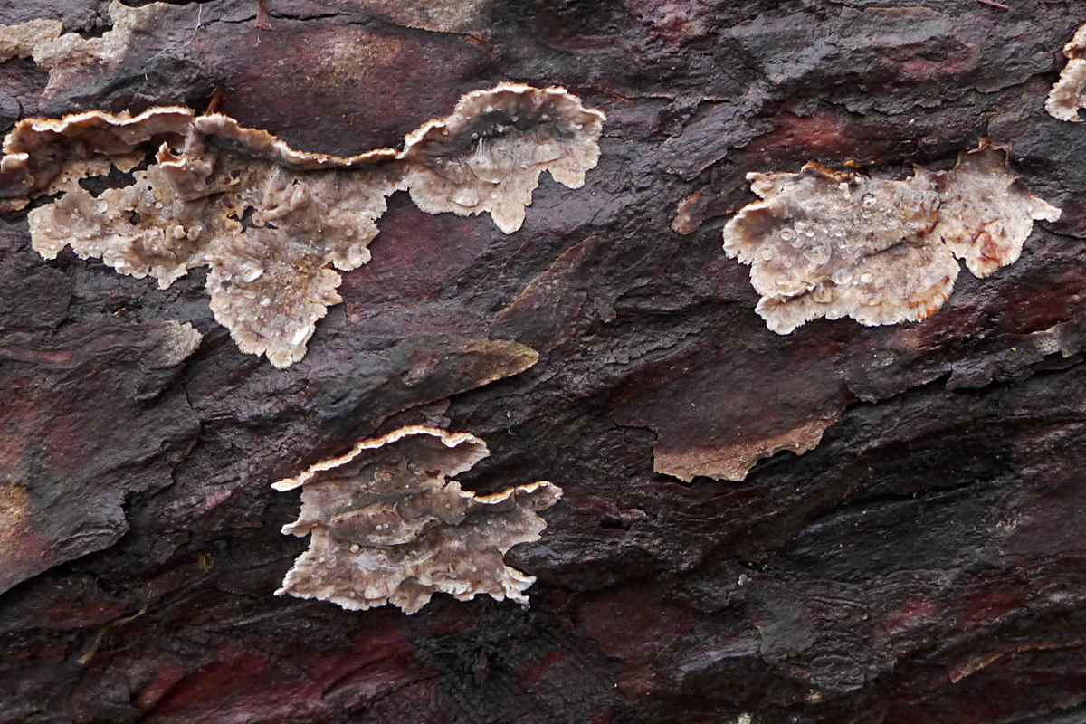Blutender Nadelholzschichtpilz, Stereum sanguinolentum an gleichen Lärchentotholz, bei mir relativ rar.
