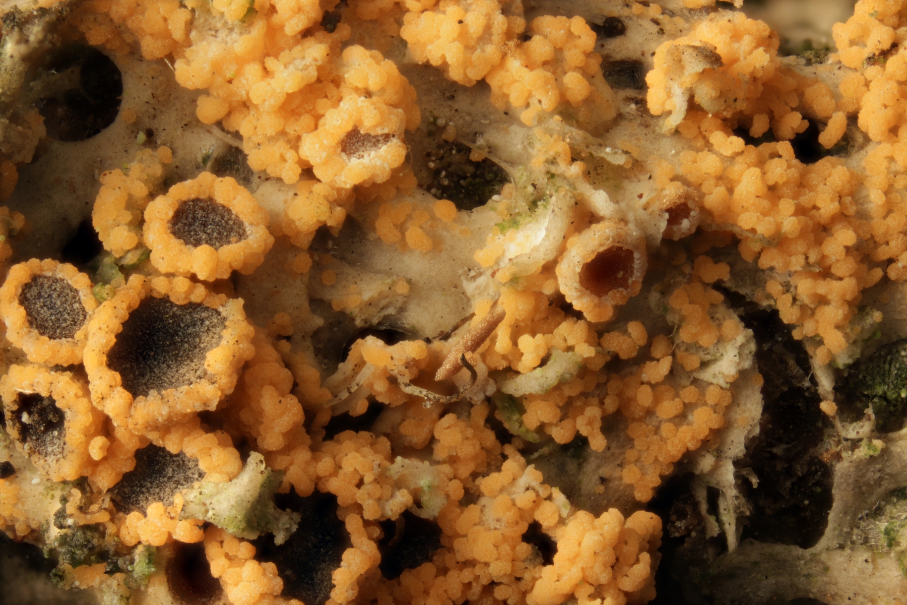 Bei dem Fund handelt es sich um den Flechtenparasiten Marchandiomyces aurantiacus der auf Flechten parasitiert.