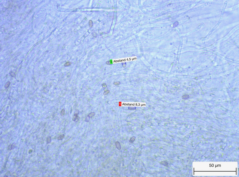 6. Präparat vom Gallertfleischigen Fältling mit vielen Fremdsporen