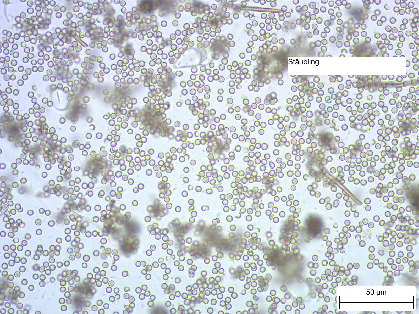 Für mich war der Tipp, als erstes Präparat nicht einen Pilz sondern zwei aufgespleisste, kreuzweise übereinandergelegte Fäden in rot und grün zu verwenden, eine wirkliche Erleichterung. Die Suche des Objekts und das Scharfstellen waren einfach und die Bedienung der verschiedenen Rädchen und Stellmechanismen, sowie das Köhlern (justieren des Mikroskops), erklärten sich quasi von selbst beim Üben. Ich habe bislang nur mit Wasser und dem 40er Objektiv gearbeitet. Die Ergebnisse nach ein paar Übungsstunden sehen so aus (edit: ich habe nur Lamellen mikroskopiert):