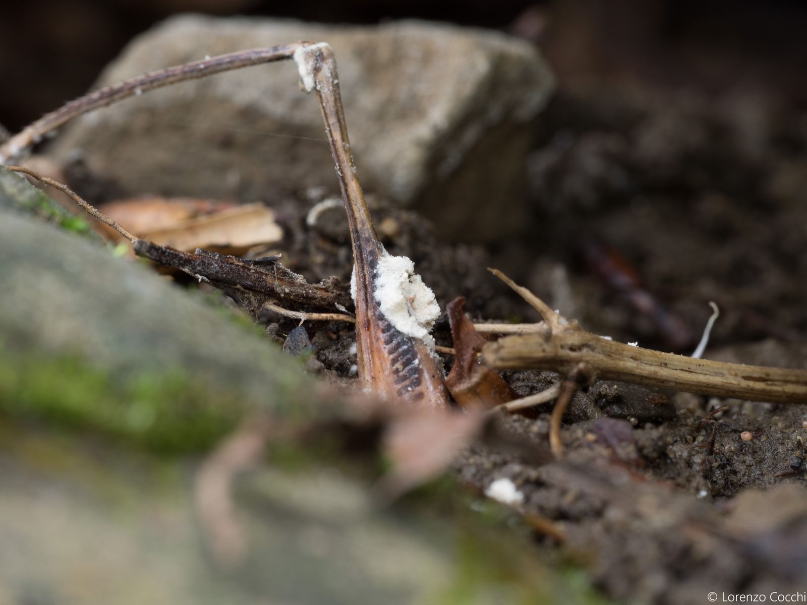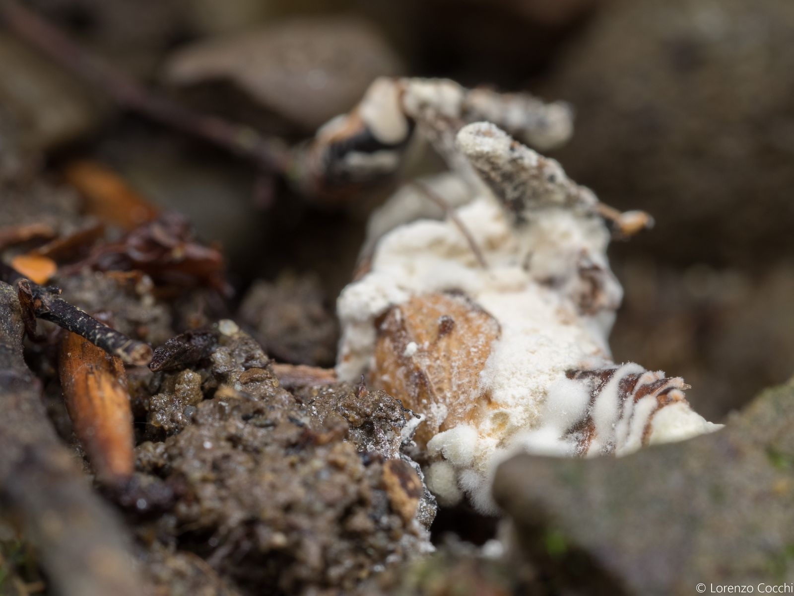 Es handelt sich hierbei um den Pilz Erynia nebriae der Laufkäfer (genauer Nebria brevicollis) befällt.