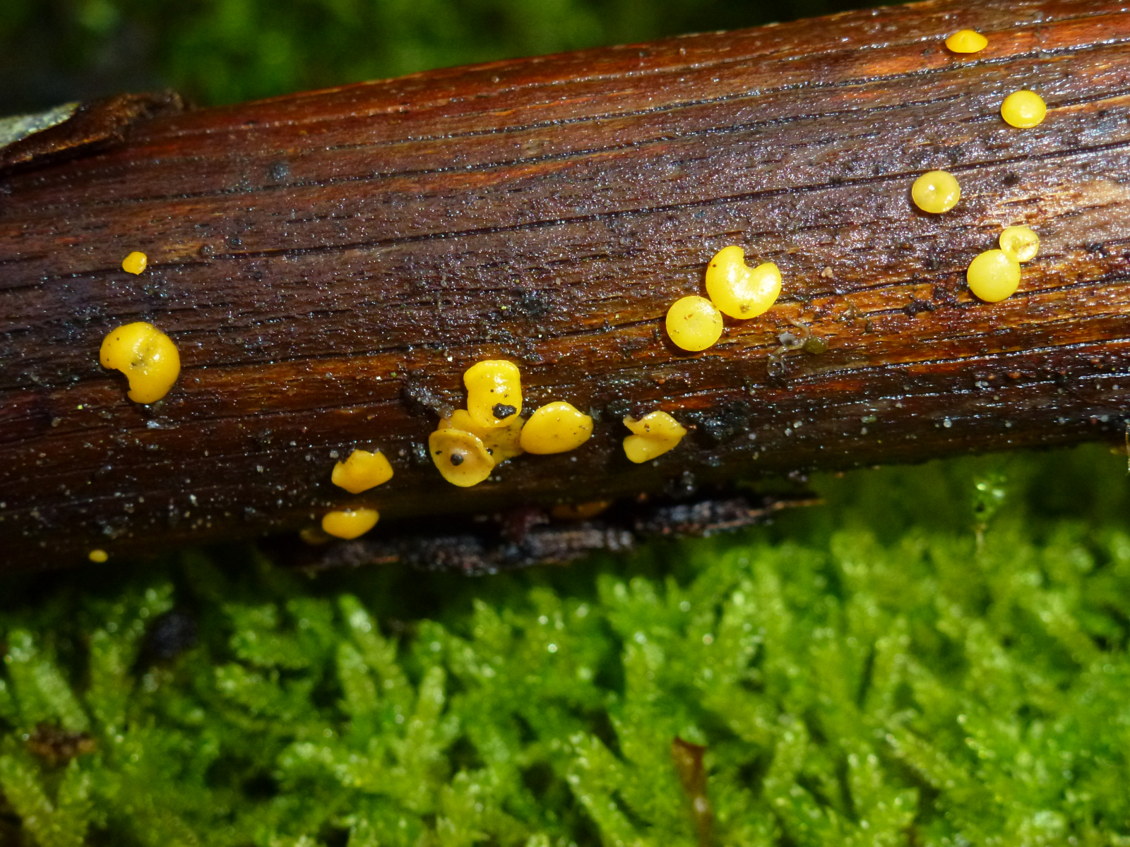 Die nachfolgenden Pilzchen sind vielleicht bis zu 0,5 cm groß, geleeartig, einen Stiel konnte ich nicht feststellen, sie ließen sich leicht lösen. Zuerst sah ich nur ein paar ganz, ganz kleine die irgendwie "lippenartig" waren, dann sah ich die etwas größeren, die eigentlich alle eine Art Delle in der Mitte hatten. Dort wo der Pilz am Holz angewachsen ist befindet sich ein schwarzer Punkt. Gefunden habe ich die Pilze in einem Mischwald.