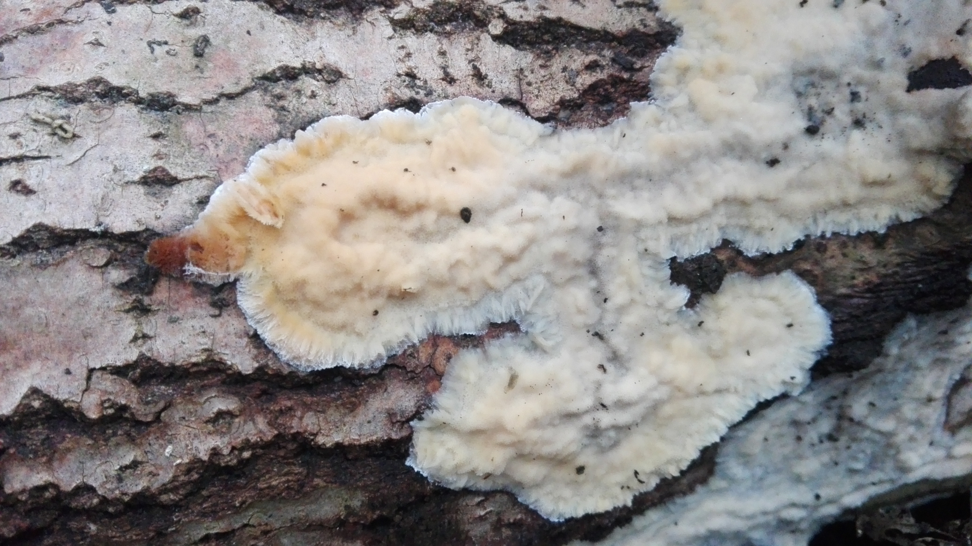 Der resupinate porling wuchs an der Unterseite eines liegenden pappelstammes, war sehr großflächig und auch substratübergreifend (clematis und anderes laubholz). Von der Konsistenz ist er wie ein saftporling, wässrig aber doch sehr zäh. Er ist geruchlos. An den Rändern ist er sowas wie ausgefranst - wie bei phlebia tremellosa. Aber seht selbst...